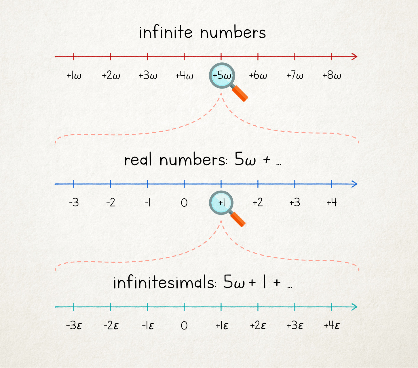 With infinitesimals in place, we can pull off the elementary school trick once more: we construct the realm of infinite numbers by taking the inverse of the infinitesimals we introduced in the previous step. The step gives us a third number line “above” reals:
