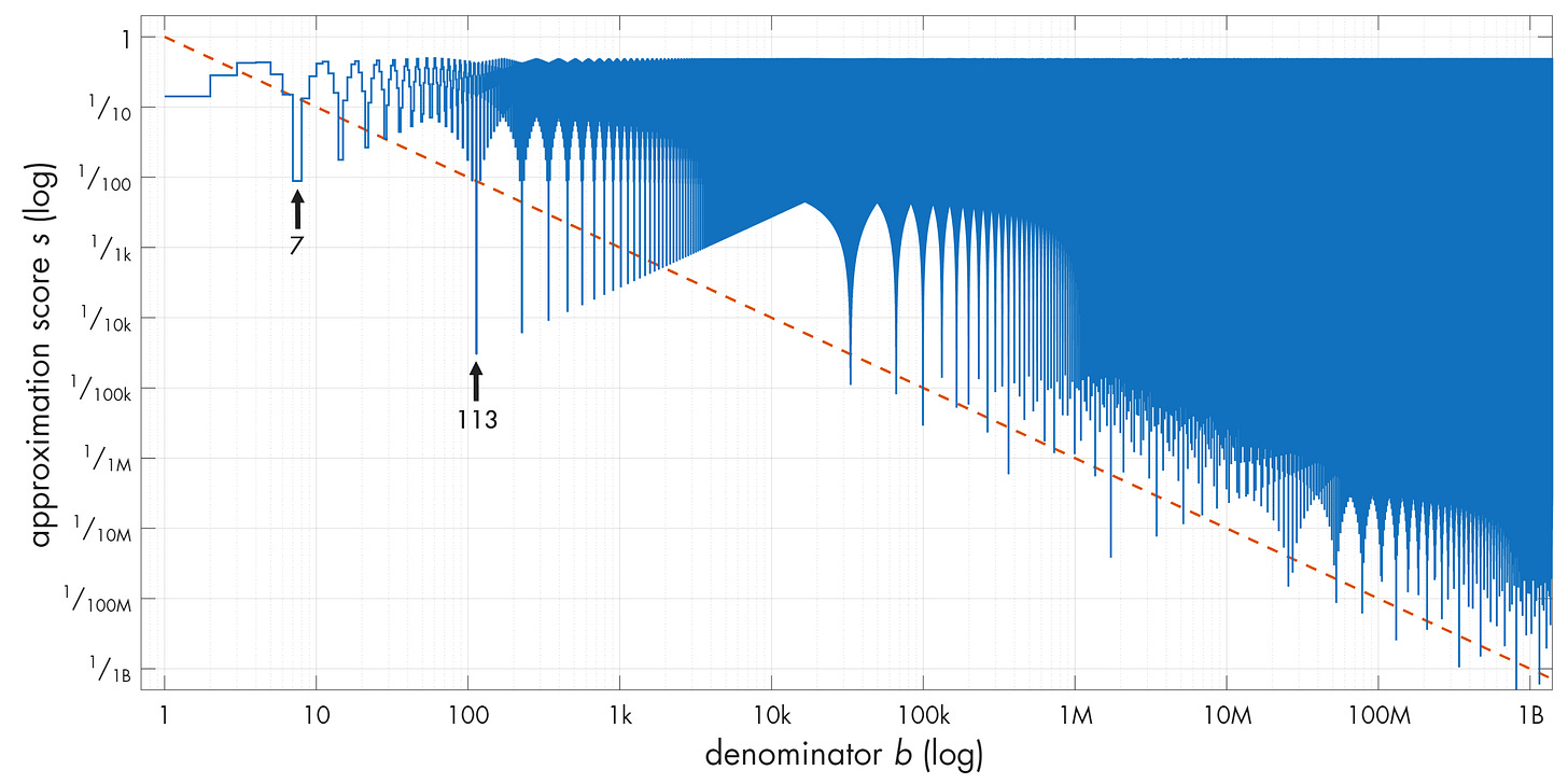 Note that the plot keeps dipping below the 2-good line over and over again. And there are some really nice approximations in there! The first arrow points to 22 / 7 ≈ 3.143 (s ≈ 0.009). The second arrow points to an even better one: 355 / 113 ≈ 3.141593 (s ≈ 0.00003). What’s up with that?