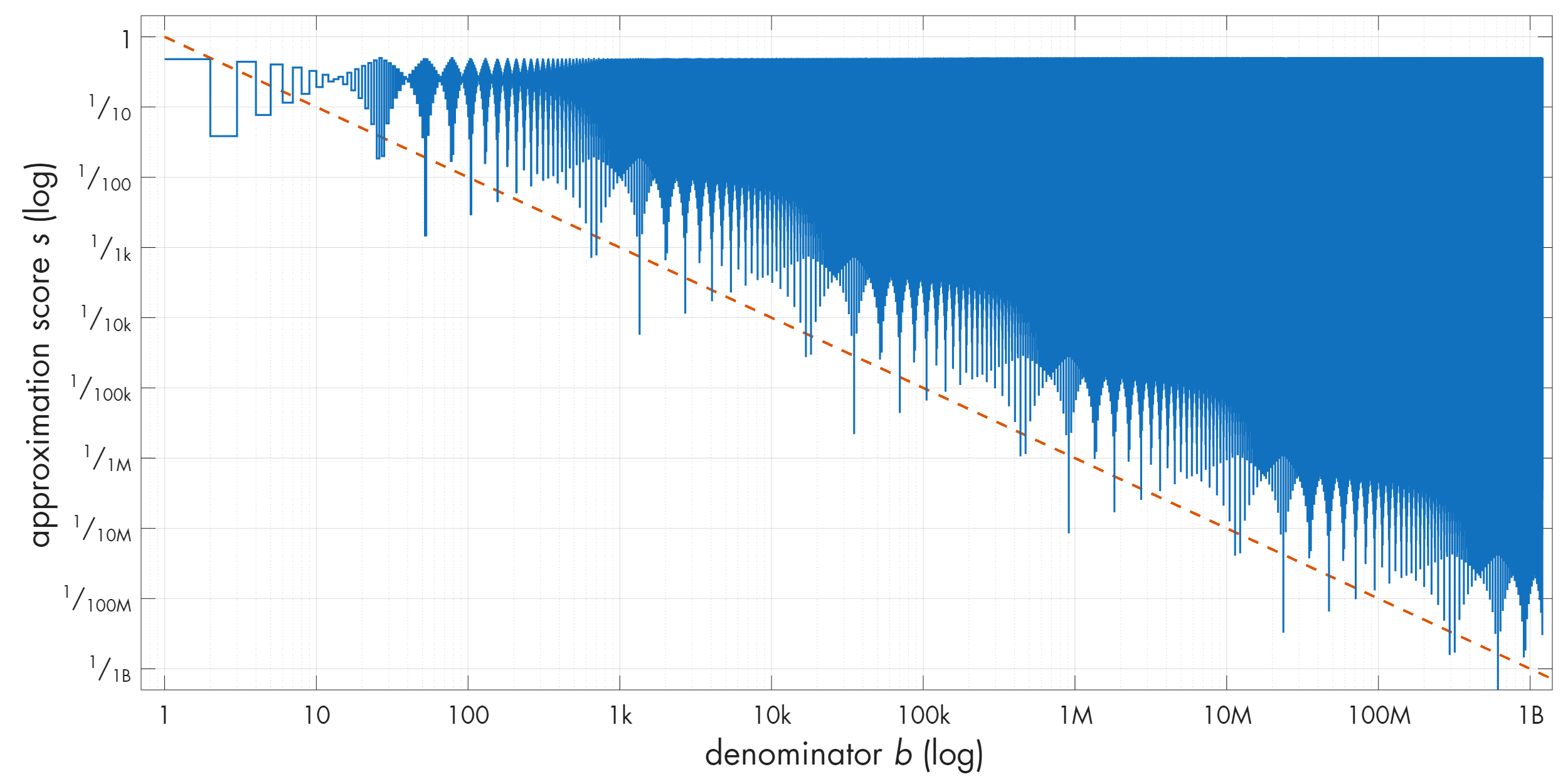 In this log-scale plot, I also included a diagonal line that represents error values decreasing with the square of the denominator (1/b²). Approximations for which the error dips below this line would be markedly better than the ones that merely dip below 1/b. We can label these 1/b² solutions as 2-good.