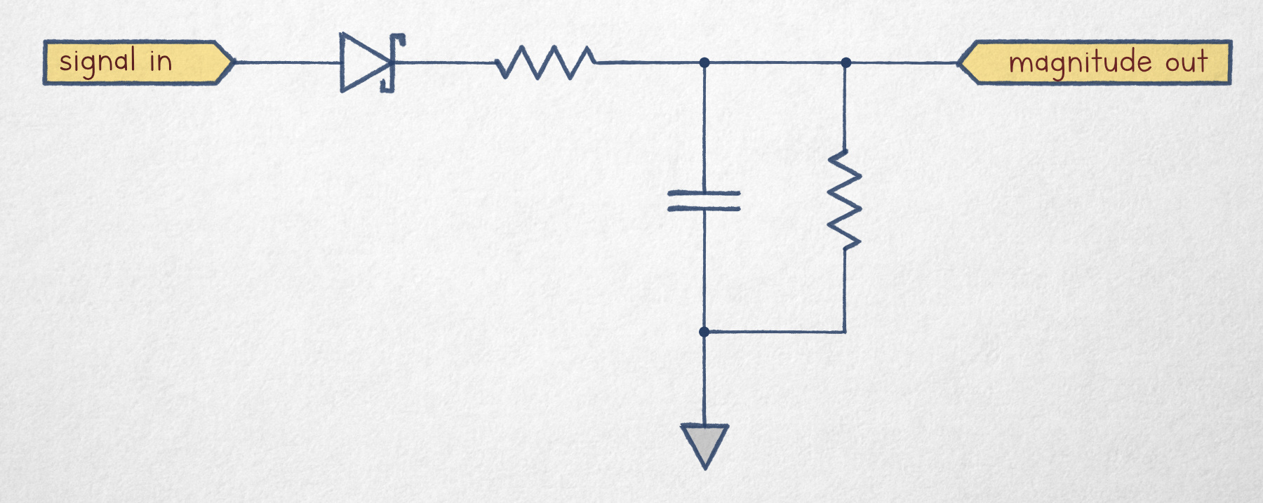 Whenever the input signal reaches a positive peak, the capacitor is charged through an input resistor and a Schottky diode, causing output voltage to rise; in the absence of peaks higher than the capacitor’s current voltage, the charge is slowly dissipated via the comparatively larger resistor on the right. Resistances and capacitances can be chosen to balance the circuit’s response time.