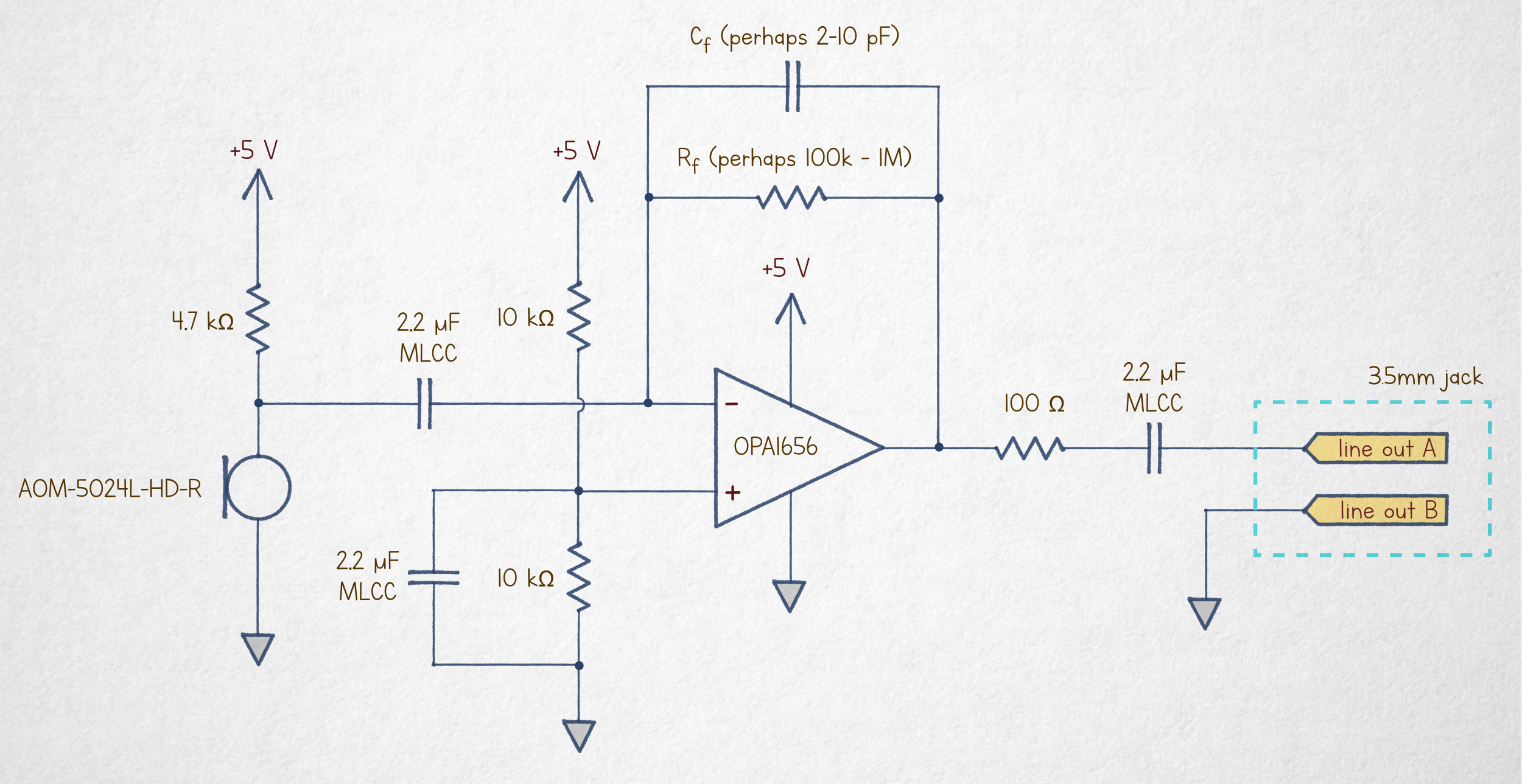 For most of the schematics in this article, I’m using OPA1656 — a rather impressive amplifier package available from Texas Instruments. That said, I selected the chip not just because of its excellent noise or bandwidth specs, but because of its reasonable cost (about $1.25 per op-amp). Other acceptable choices include OPA2322, OPA2323 and MCP6022.