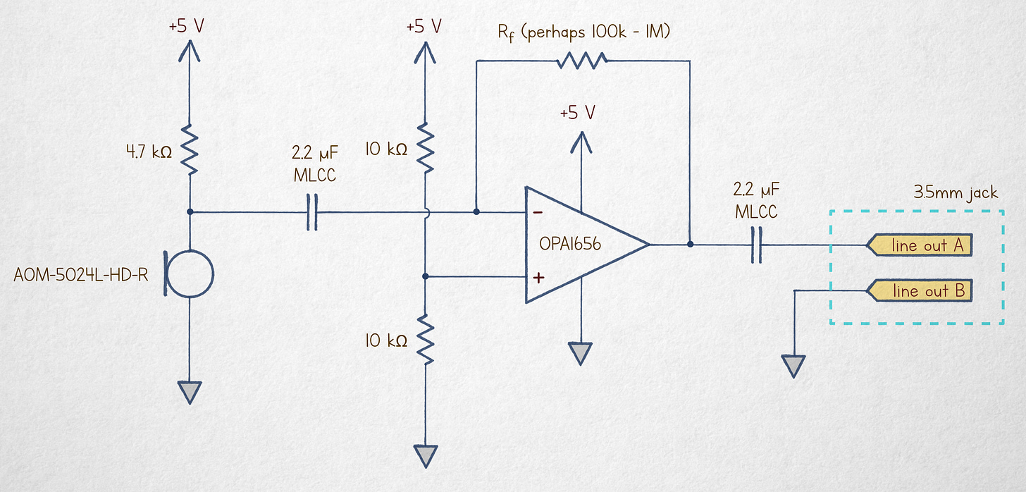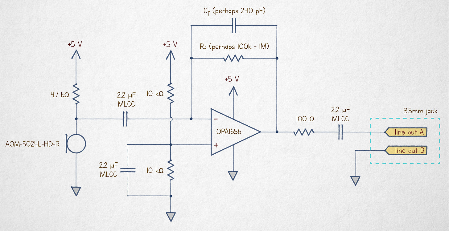 A good number of hobby microphone amplifier circuits published on the internet are needlessly complicated, often because of their reliance on antiquated parts and outmoded design paradigms. If the microphone can be placed physically close to the amplifier, the simplest design is a single-supply, single-ended transimpedance amplifier (TIA) — a circuit that essentially converts the current flowing through the microphone directly to output voltage: