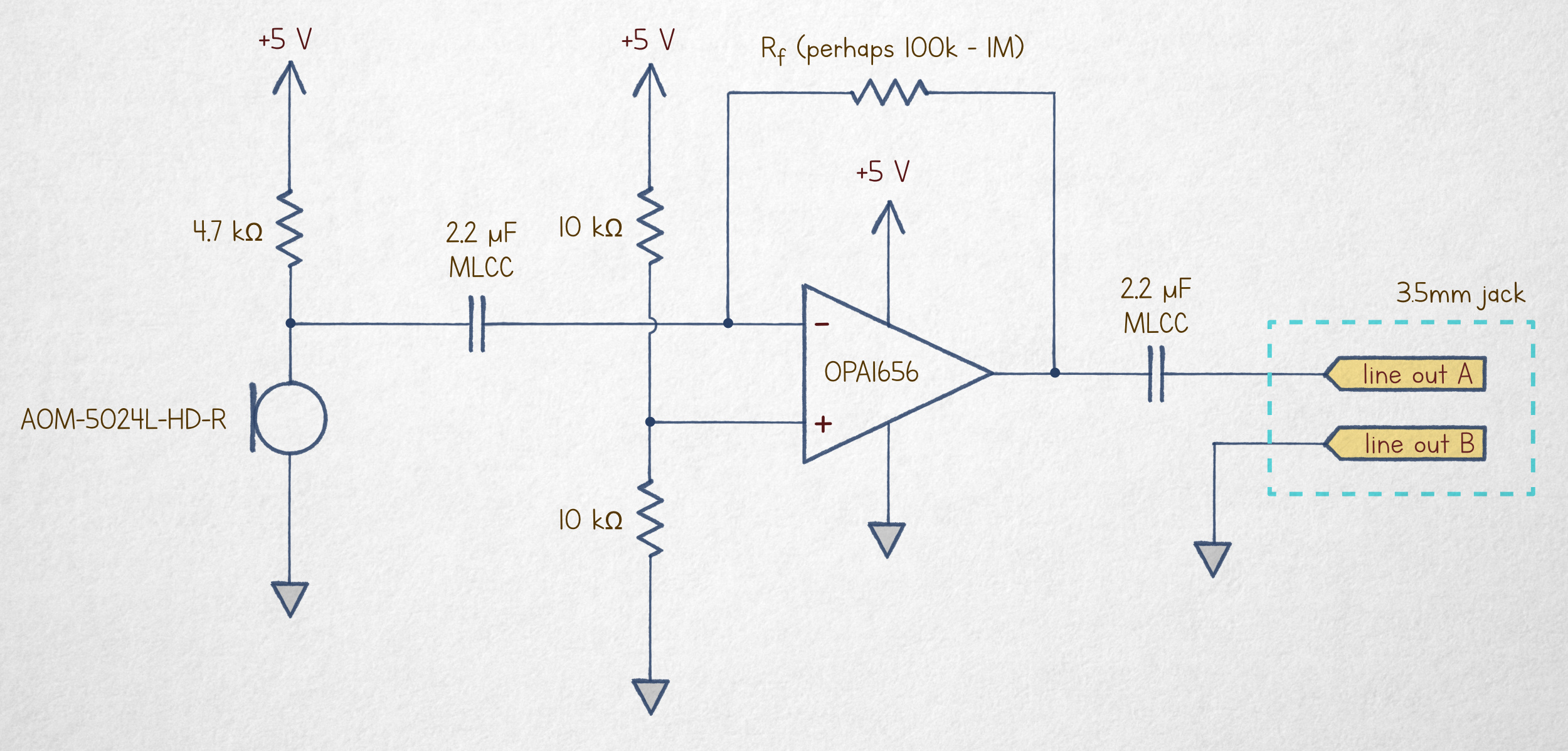 Note for the schematic: if using an IC with more than one op-amp in a single package, the inputs of the unused op-amps should be grounded. I also omit a supply decoupling capacitor, but one should be placed near the chip.