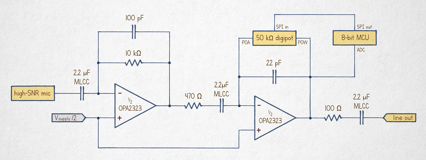 In the new design, the first half of the op-amp IC provides fixed (and comparatively modest) current-to-voltage amplification ratio for the electret microphone, while the second half implements a variable-gain voltage amplifier controlled by the MCU. Lowpass capacitors are proportionately larger due to lower feedback resistances involved at each stage.