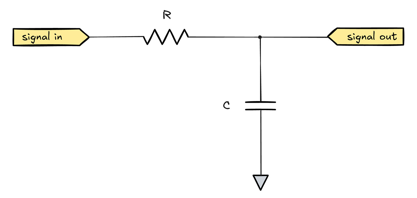 In today’s episode, let’s continue down that path and consider an even more perplexing example: a switched capacitor lowpass filter. The usual way to design an analog lowpass filter is to combine a resistor with a capacitor, as shown below: