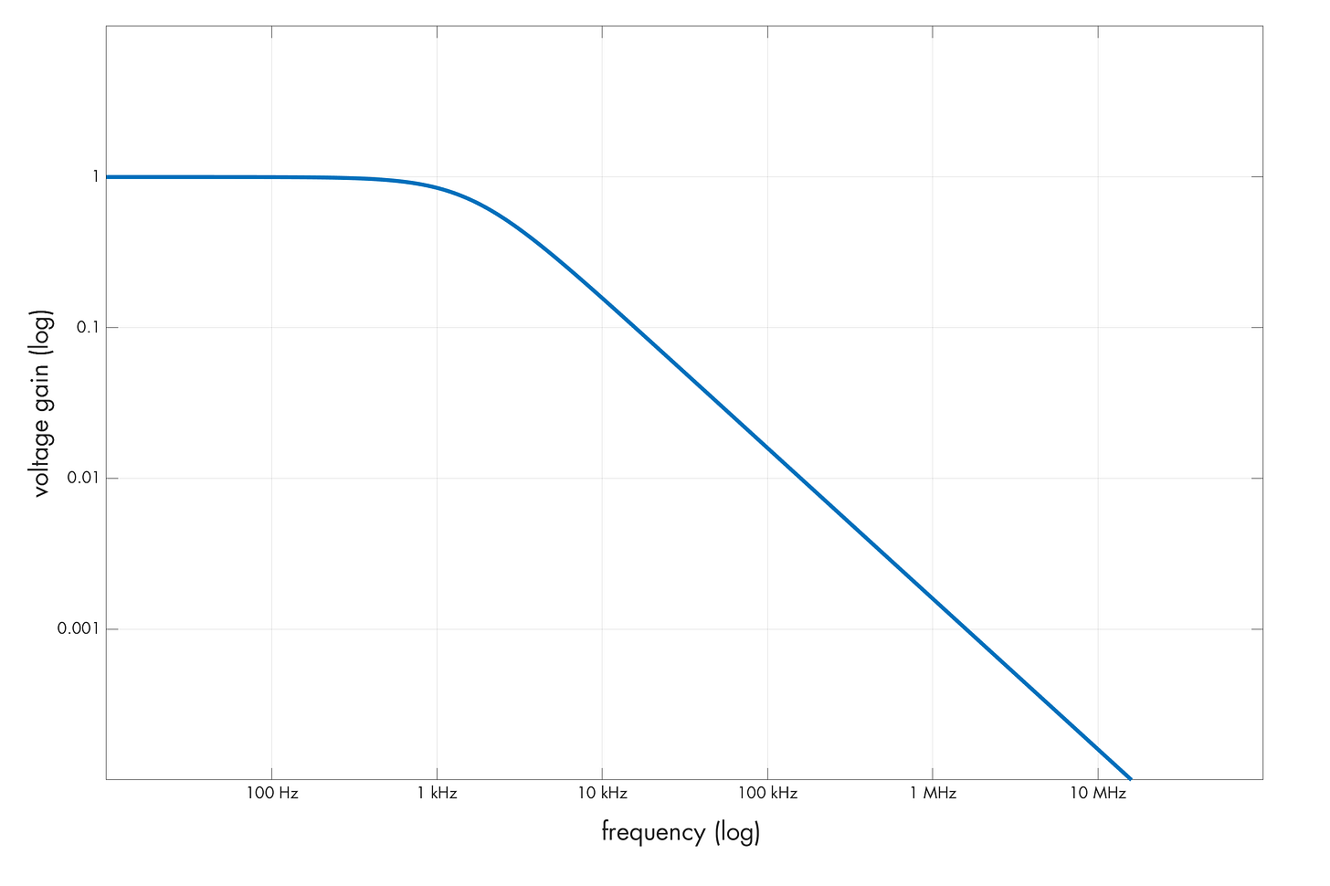 In an R-C lowpass circuit, the reactance is initially much larger than the value of R, so up to a certain frequency, the capacitor can be ignored and the input voltage is more or less equal to the output voltage. Past a certain point, however, the reactance of the capacitor becomes low enough so that the signal is markedly pulled toward the ground, attenuating it and producing a filter response plot similar to the following: