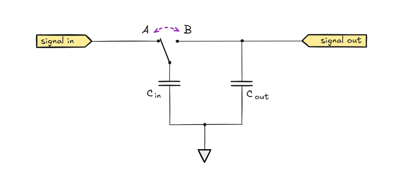 This is basic analog electronics, and something we covered on the blog before. But did you know that you can construct a perfectly good lowpass filter with a pair of capacitors and a toggle switch? The architecture is shown below: