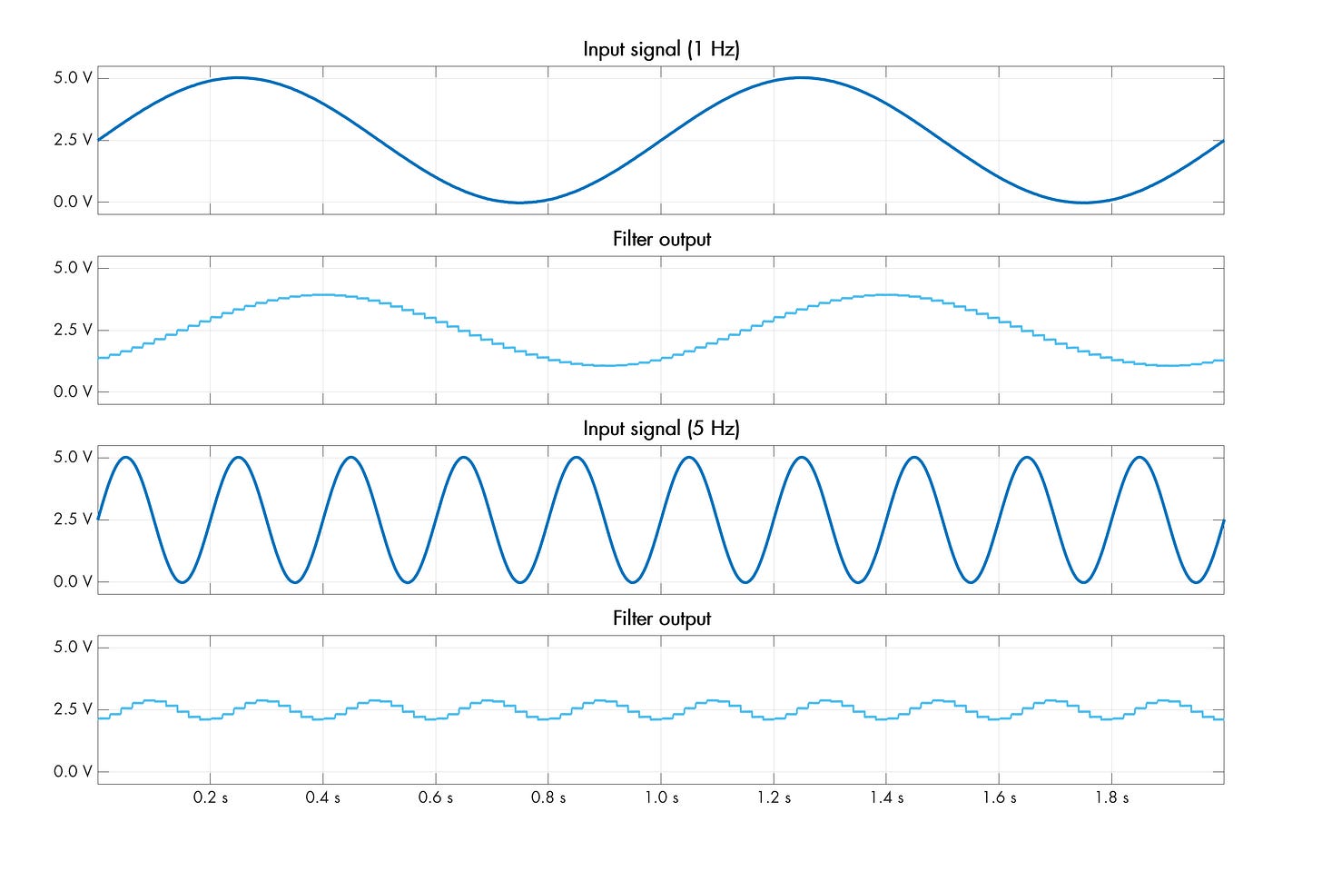 The math might seem improbable, but the circuit works in practice. The following oscilloscope traces show a filter constructed with Cin = 100 nF and Cout = 1 µF, toggled at fs = 50 Hz. This corresponds to fknee ≈ 0.8 Hz — and indeed, we see some attenuation for a 1 Hz input sine, and a lot more for a 5 Hz one: