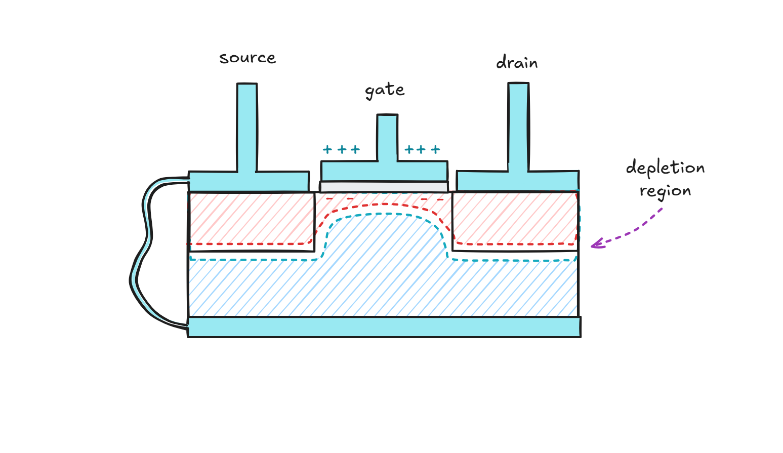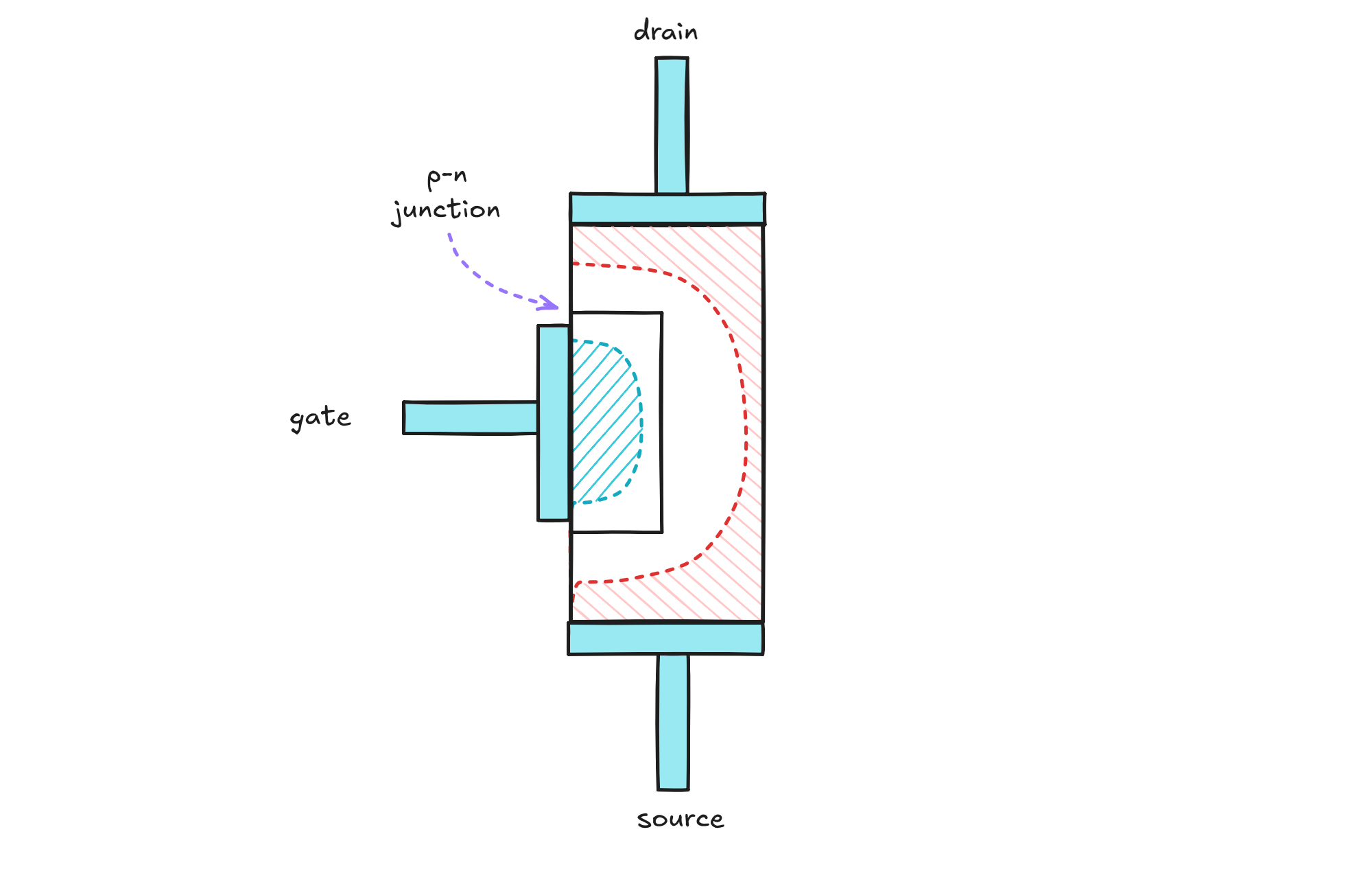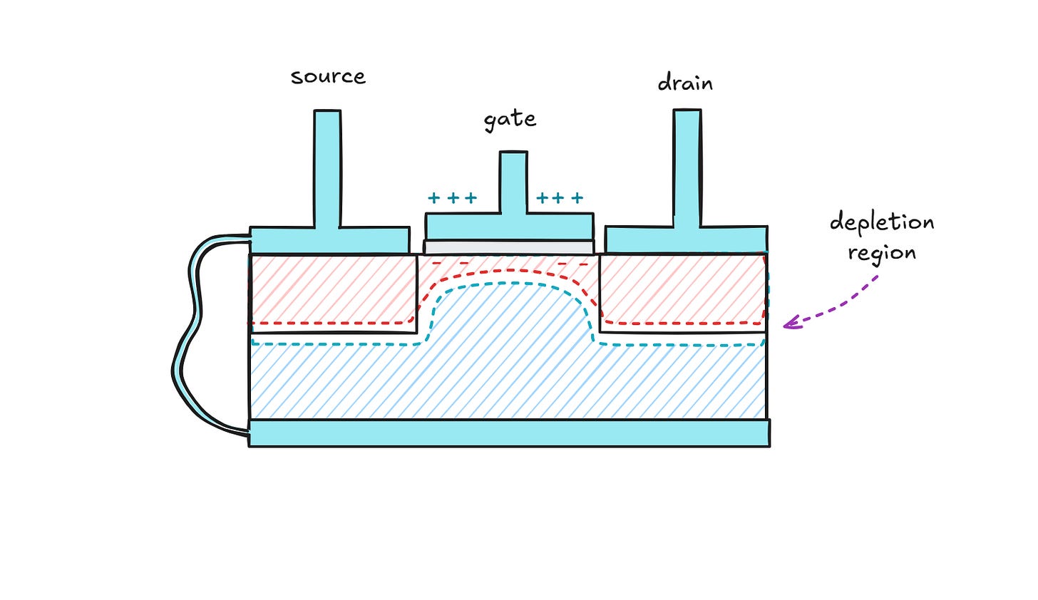 When the gate voltage is around 0 V relative to the n-region, the depletion layer is present but very thin, so it doesn’t impede the flow of current between the source and the drain. But as the voltage is lowered, the junction becomes reverse-biased, the depletion region expands, and the effective width of the channel shrinks. By the time you get to perhaps -5 V, it grows so large that it pinches off the conductive path through the n-doped body of the device: