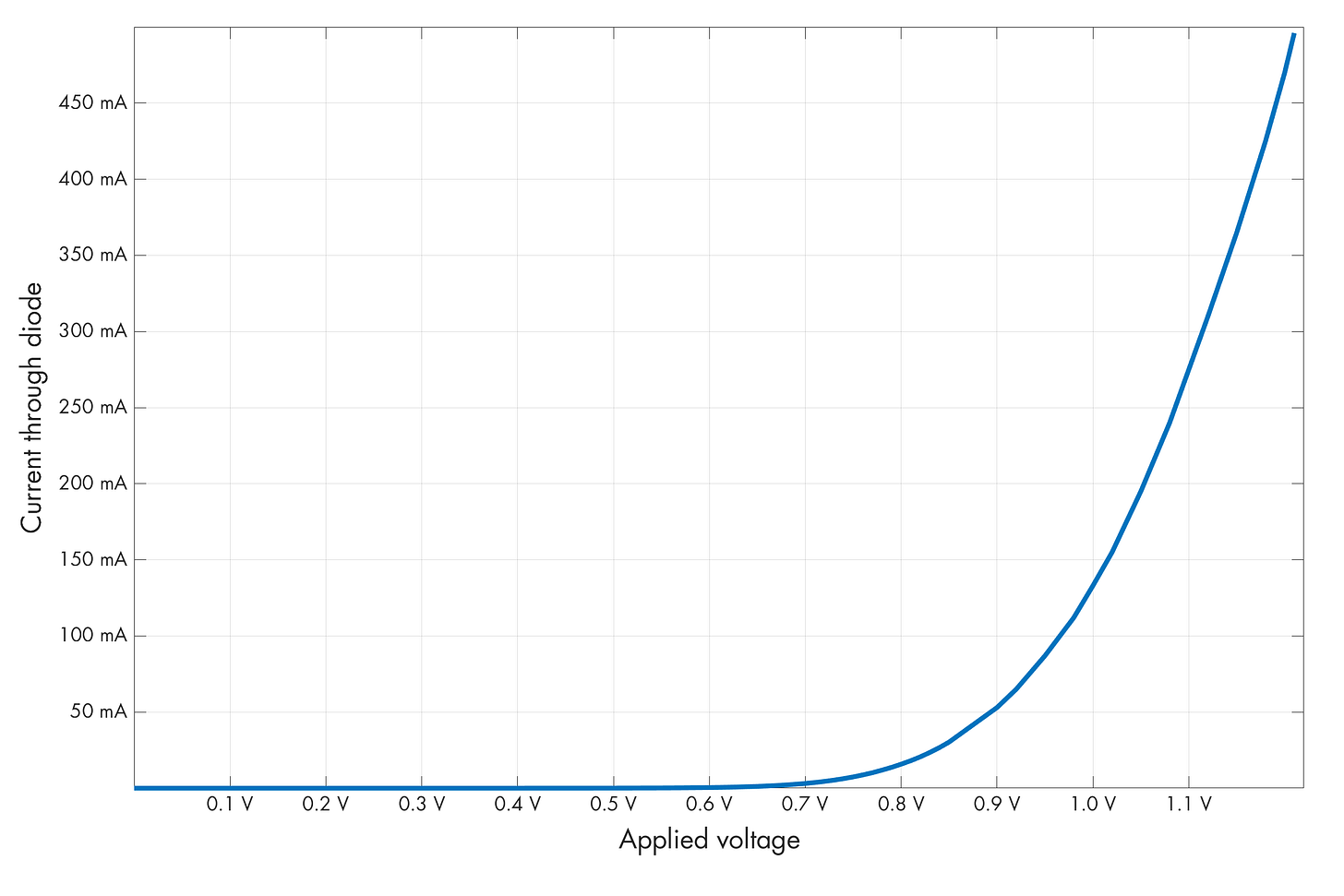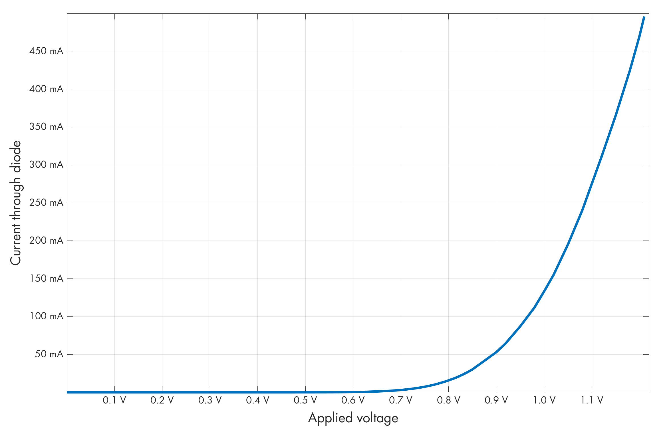 Some sources describe the diode’s V-I curve is sometimes described as exponential, but this is not true for real-world components. At first, the current does follow that pattern; but before long, the inherent resistance of the material starts to dominate and the relationship between current and the “excess” voltage becomes roughly linear.