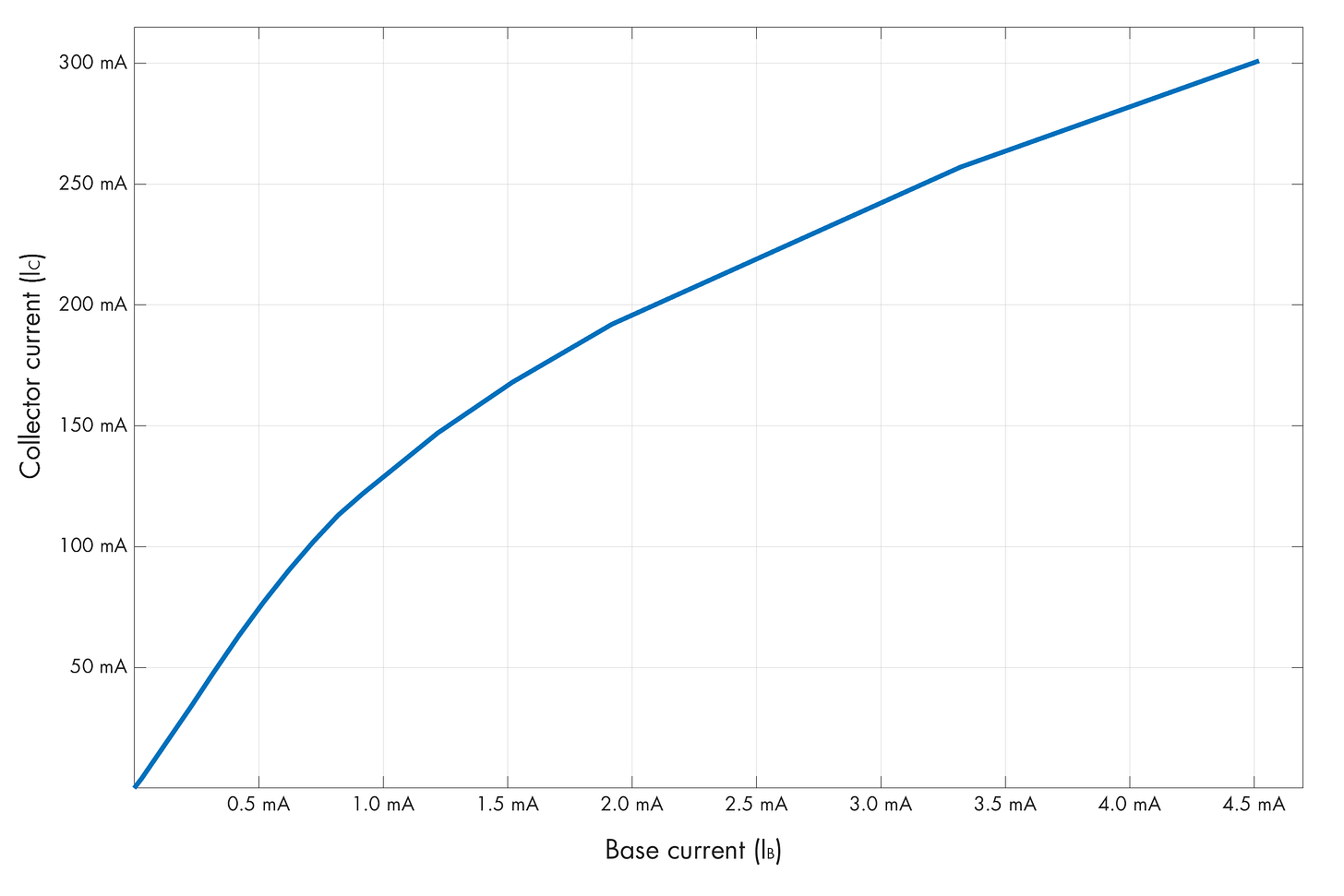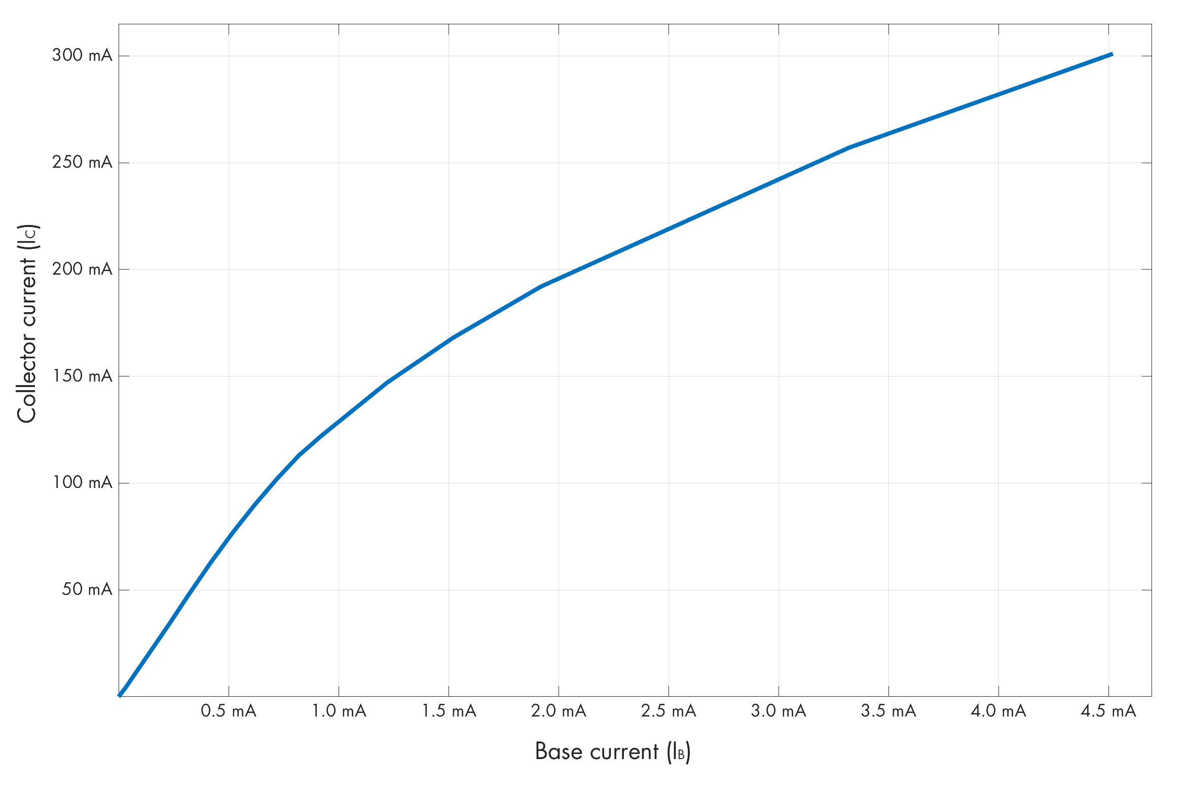 The electrons are notionally supposed to recombine with holes in the base region, but because the layer is so thin, they can also easily diffuse into the immediately-adjacent base-collector depletion region. In there, because they’re wandering into it from the “wrong” side — from the p-region where electrons are the minority charge carriers — the internal field of the B-C depletion region whisks them away toward the collector terminal, causing an unexpected “side” current to flow. In fact, in a properly-designed BJT, a relatively small base current can trigger a considerably higher current in the C-E path. There is a sorta-linear relationship between the two currents: