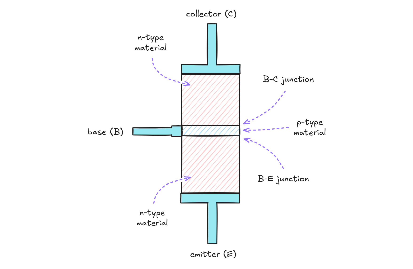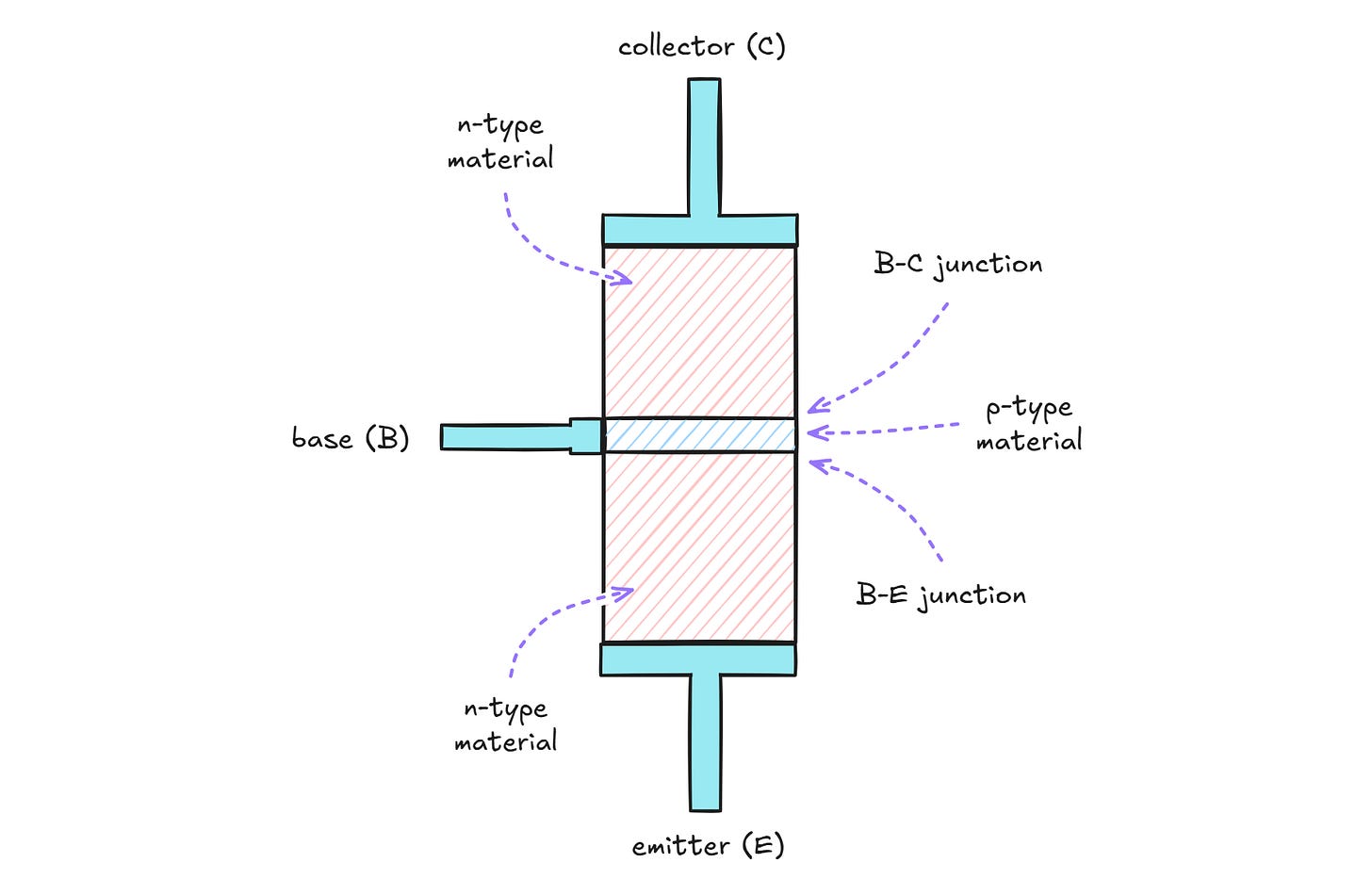 The drawing shows an n-p-n junction in the path of the current; because one half of this junction is inevitably reverse-biased, it would appear that the transistor should never conduct.
