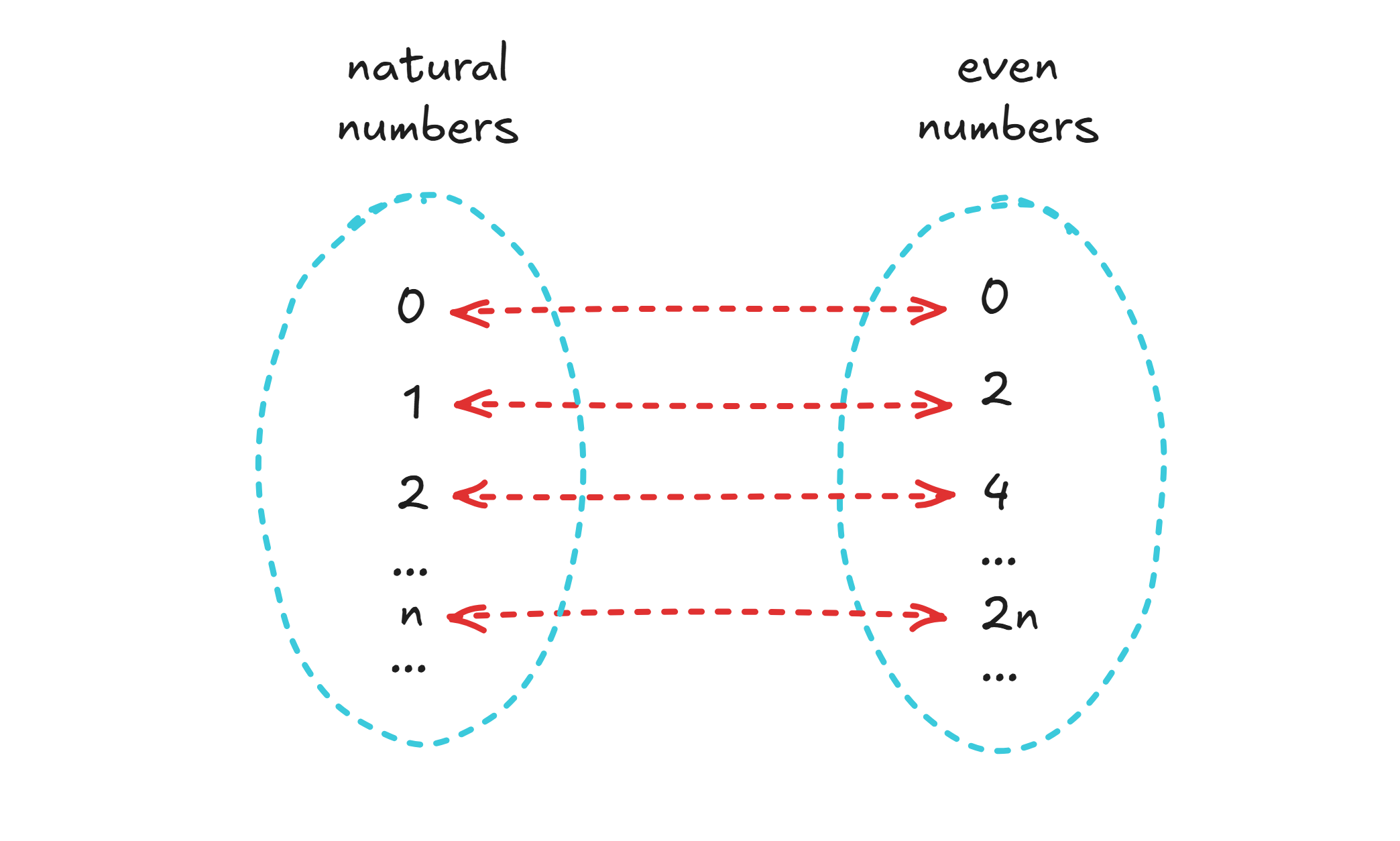 The concepts are dead simple for finite sets, but consider a set of natural numbers next to a set of every even number (E). Obviously, E is strict subset of natural numbers, so by our first rule, we could say that E is smaller than ℕ. Yet, if we’re talking about a one-to-one mapping for a pair of infinite sets, the following approach is perfectly fine: