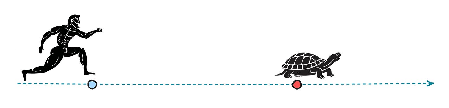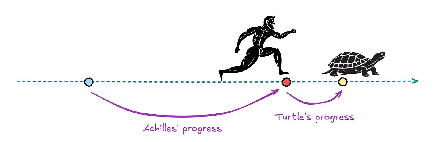 We can reason that after a while, Achilles will catch up to the turtle’s original position (red dot); however, by the time he gets there, the animal will have moved some distance forward (yellow dot):