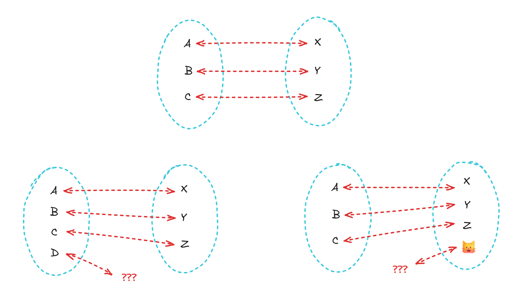 Another approach is to consider two sets to be of equivalent “magnitude” if you can map their elements one-to-one. It doesn’t matter which element gets mapped to which, as long as there are no orphaned members on either side: