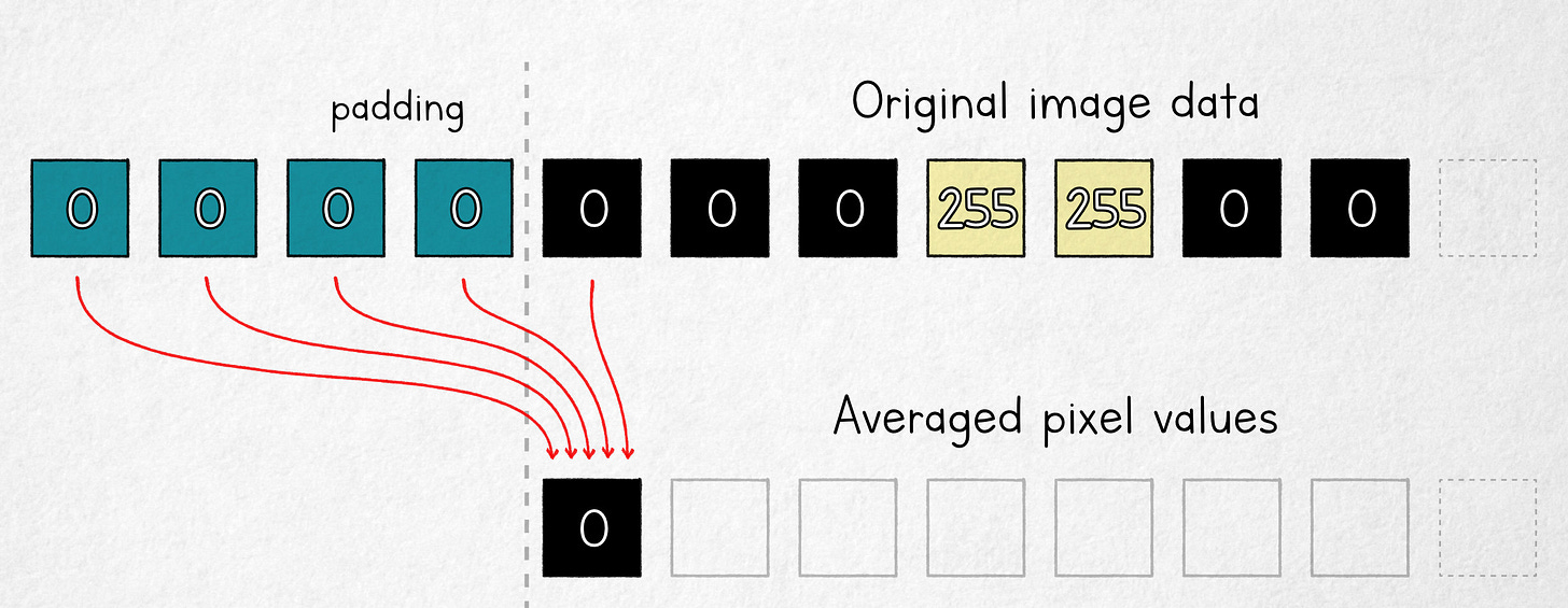Note that for the first two cells, we don’t have enough pixels in the input buffer. We can use fixed padding, “borrow” some available pixels from outside the selection area, or simply average fewer values near the boundary. Either way, the analysis doesn’t change much.