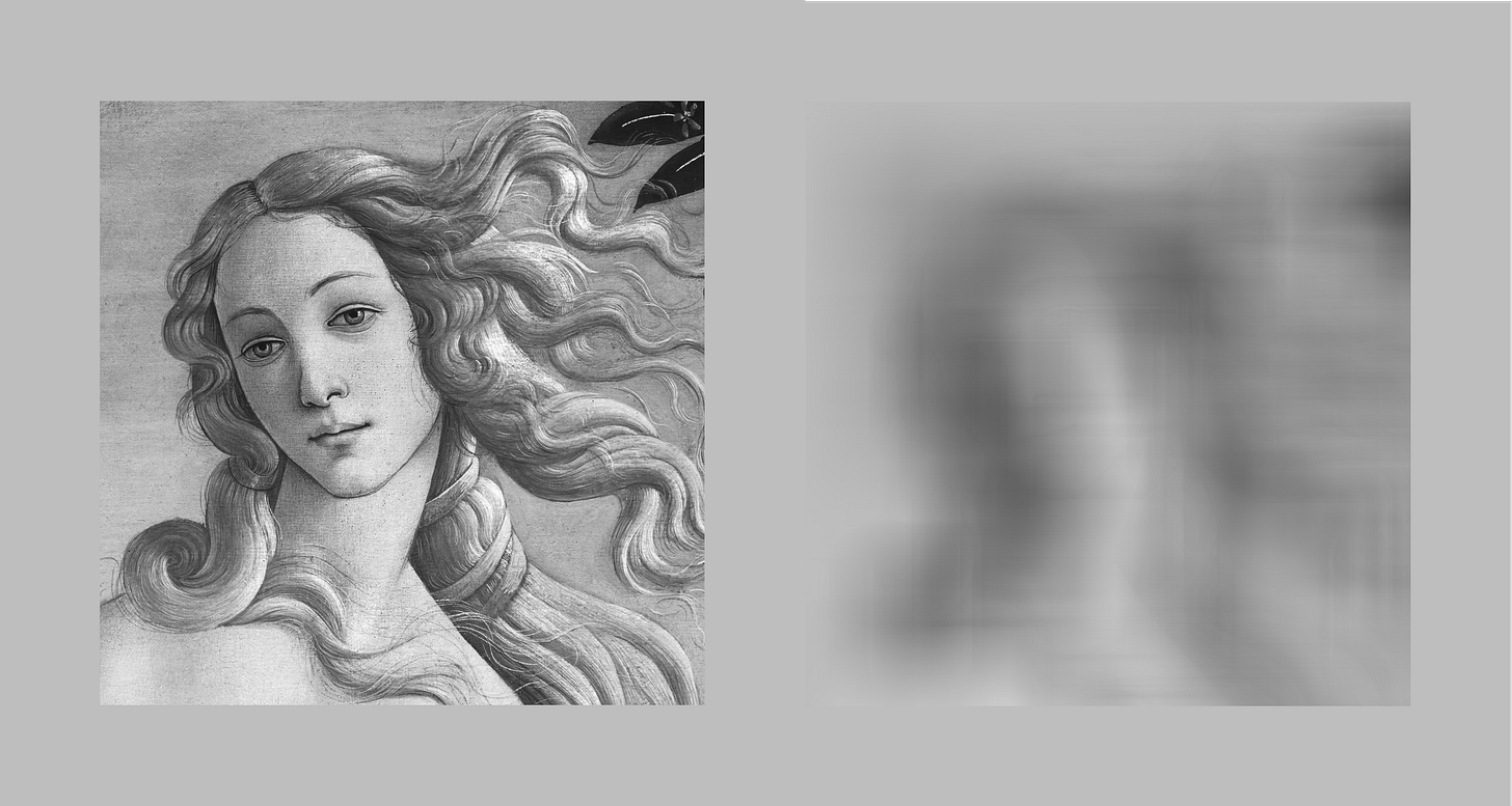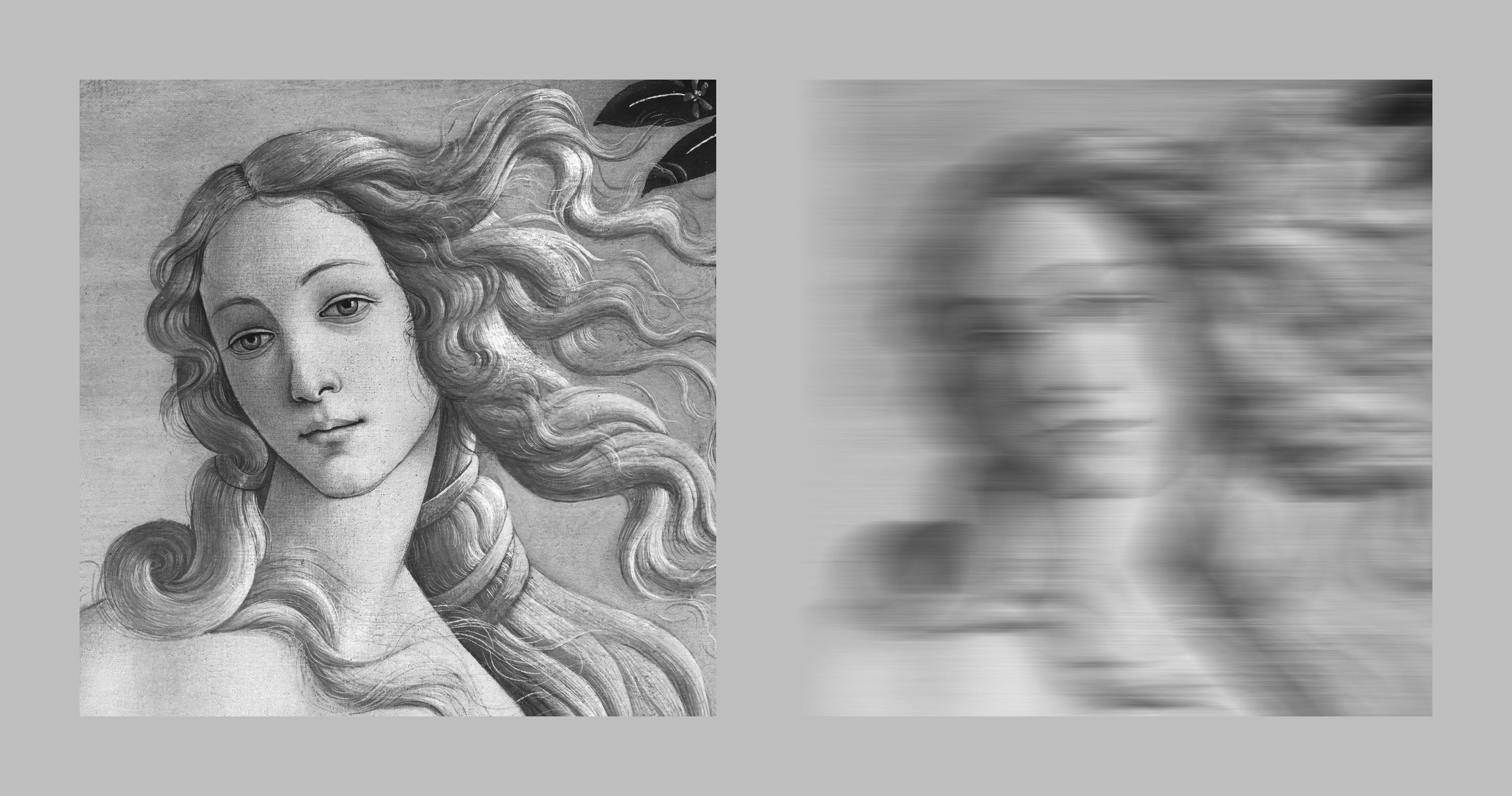 In the illustration below, the left panel shows a detail of The Birth of Venus by Sandro Botticelli; the right panel is the same image ran through the right-aligned moving average blur algorithm with a 151-pixel averaging window that moves only in the x direction: