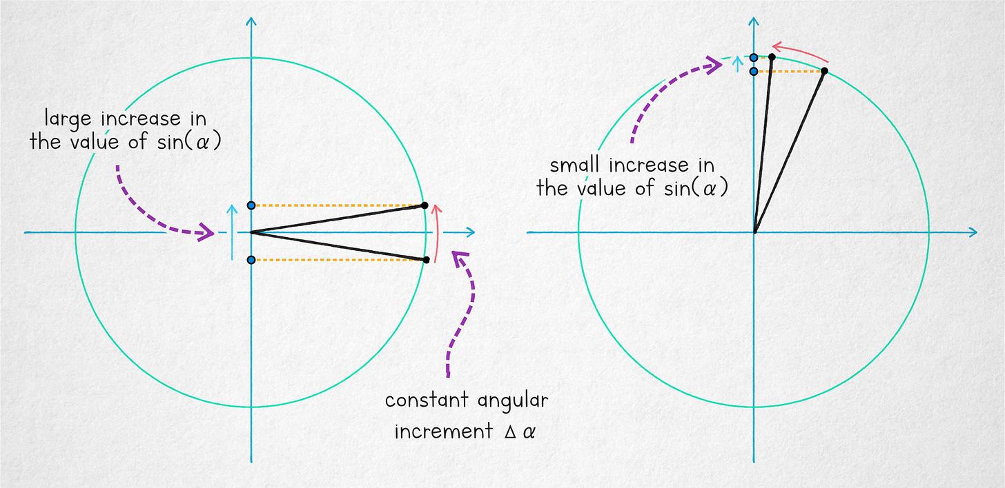 Step IV: getting rid of the sine. To fix this, we need to circle back to the second assertion about sine waves: that the slope of the y = sin(x) curve at the zero crossings is exactly +/- 45°. We can rely on the intuitive visualization discussed earlier on, or we can lean on the proof that the rate of change of sin(x) is cos(x). Since cos(0) = 1, this implies that that in that very moment, P (the increment in function parameter) = Q (the increment in function value).