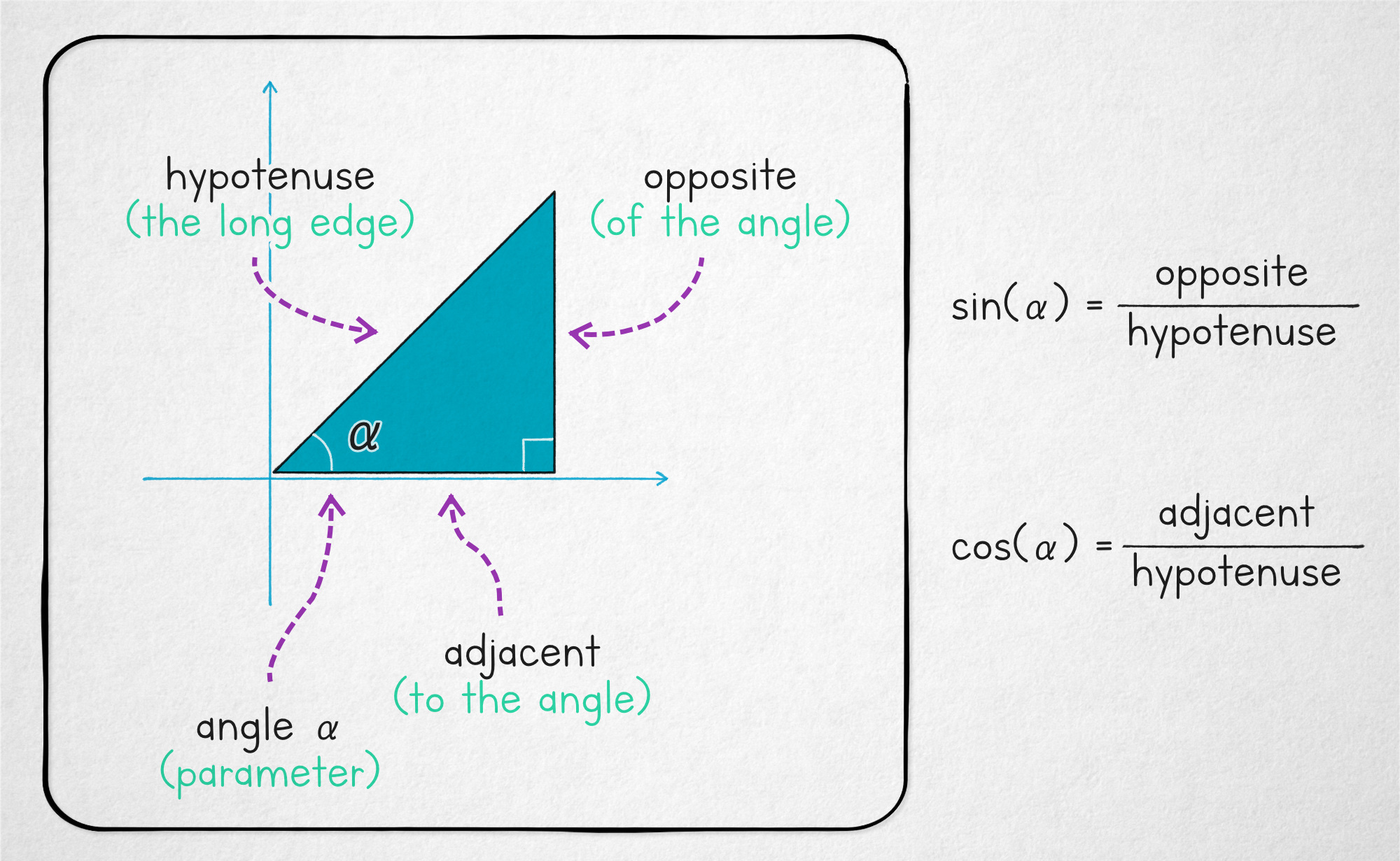 To explain why, it’s useful to look at the common high school definition of sine: it’s the ratio of the opposite (the vertical side) to the hypotenuse (the long side) of a right triangle for a chosen angle.