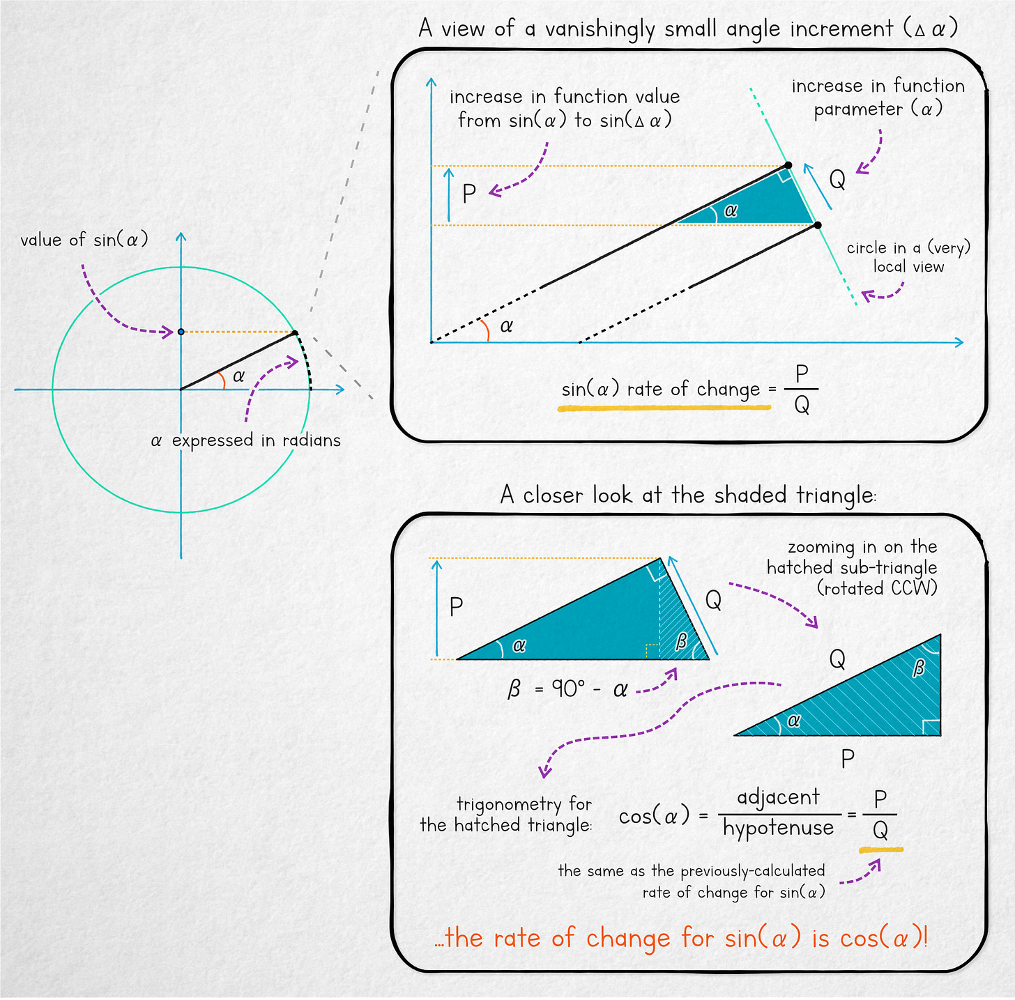Either way, as should be clear from the illustration, in this microscopic view, the momentary rate of change for the value of the sine function — that is, the length of the P segment representing the increment of the function value, divided by the length of the Q segment representing the change in its parameter along the unit circle — is the same as the cosine of the timing variable (t).