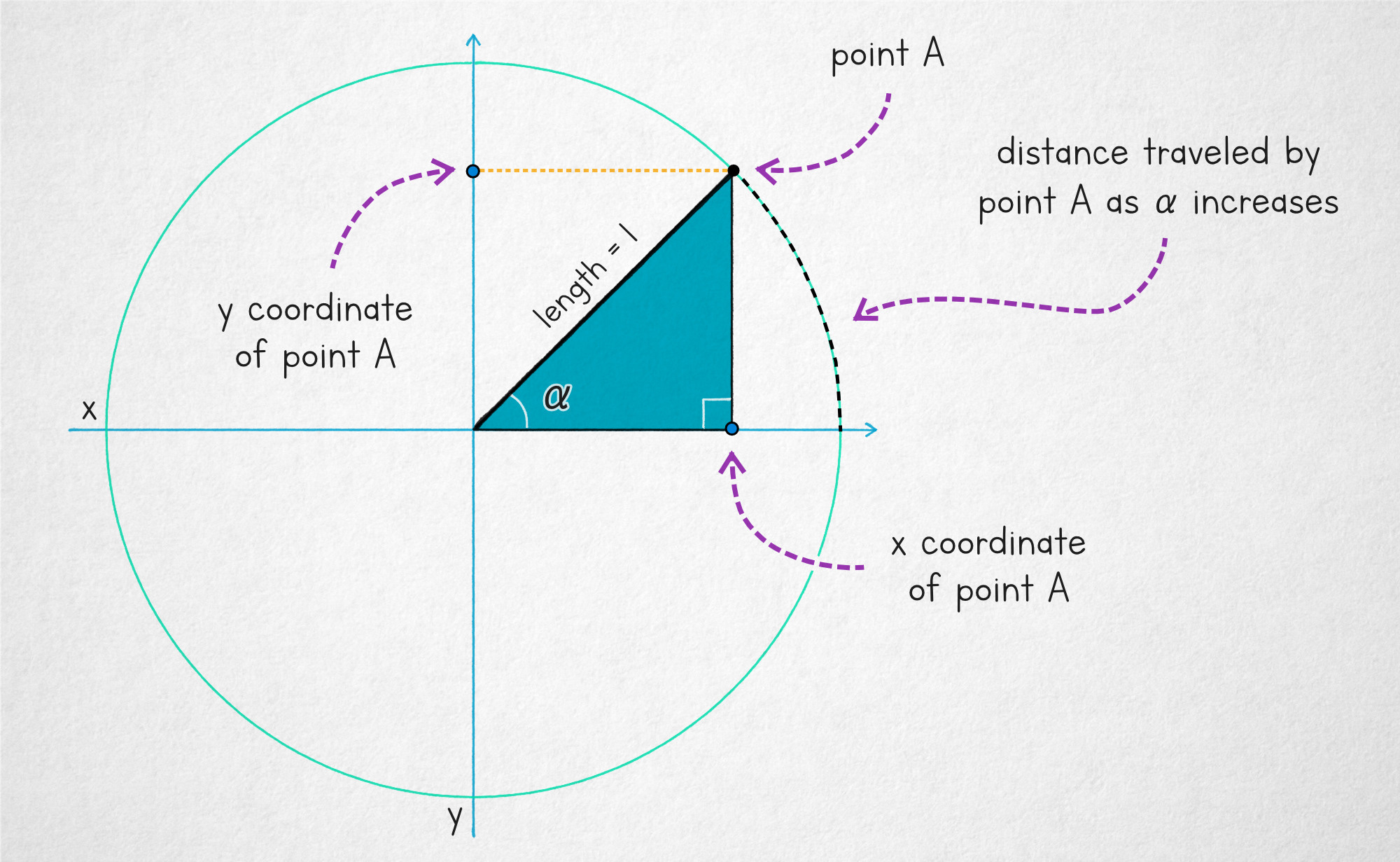 To arrive at a definition with fewer moving parts, we can also draw the hypotenuse with a fixed length of 1. If so, the value of the sine function becomes equal to the length of the height of the triangle (i.e., the y coordinate of the far end of the hypotenuse). Further, in this setting, point A will draw a circle with a radius of 1 as the angle progresses from 0 to 360°: