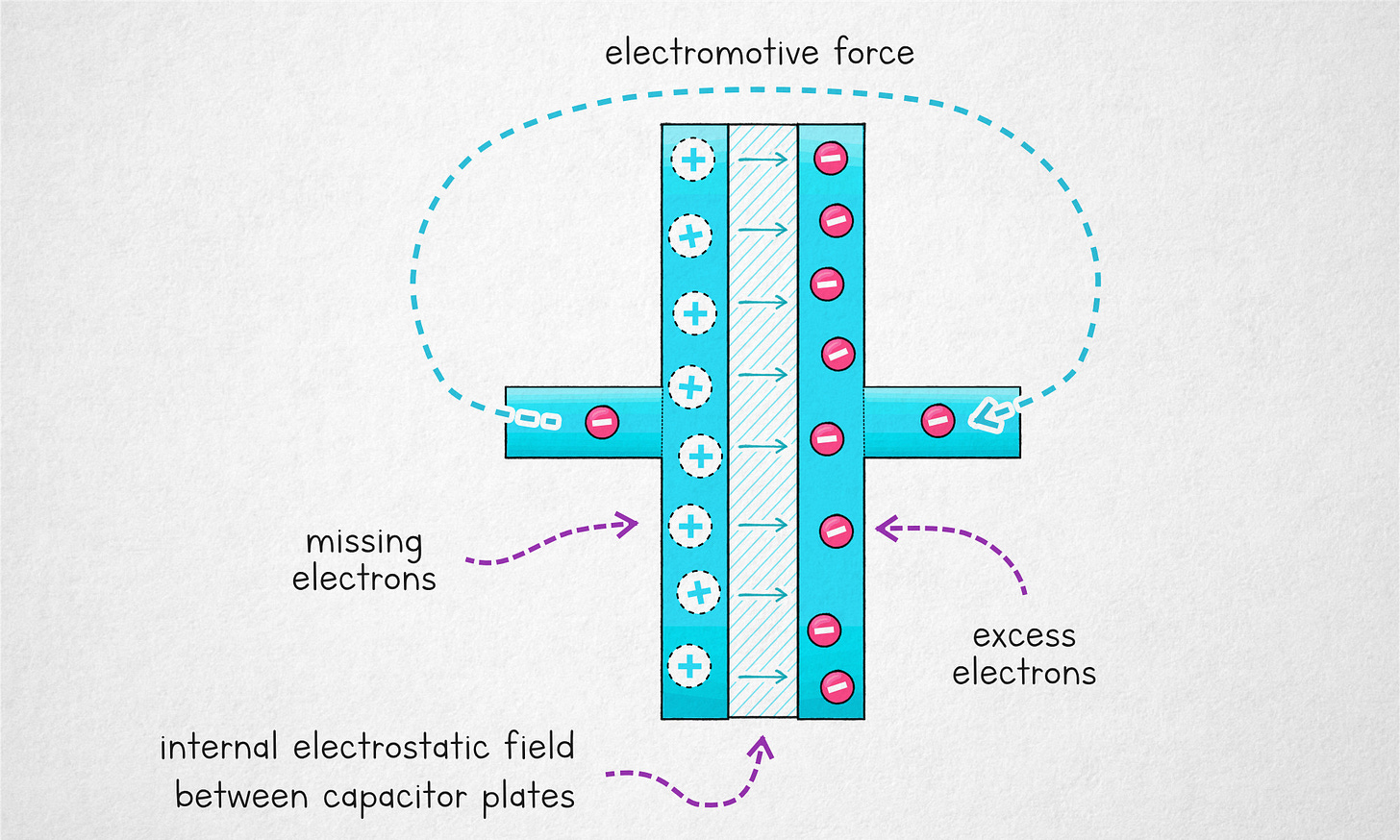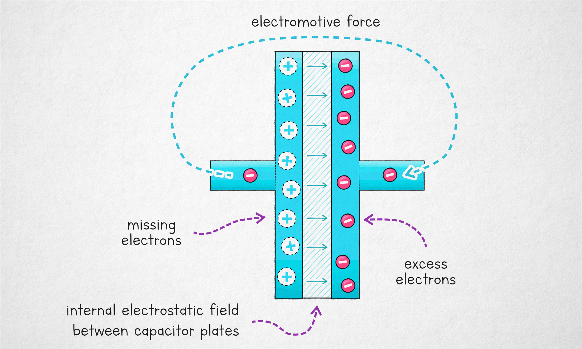 The process of charging a capacitor involves the application of an external electromotive force that shuffles electrons between two conductive plates separated by a thin insulating film. This makes one of the plates positively charged and the other one negatively charged. Due to the proximity of the plates, the resulting electrostatic field is contained largely to the thin gap and mostly cancels out elsewhere. Because of this, the “pushback” force that would normally prevent us from moving the charges around is diminished and a fairly substantial amount of charge carriers can be displaced by a relatively modest voltage.