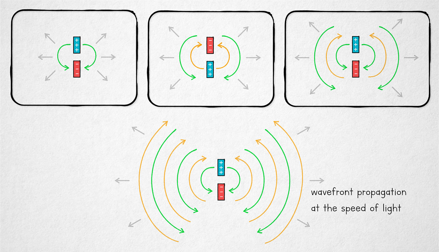 The situation changes if we start moving charges back and forth between the plates. This produces an interesting effect: a ripple-like pattern of alternating fields that are getting away from the ex-capacitor at the speed of light: