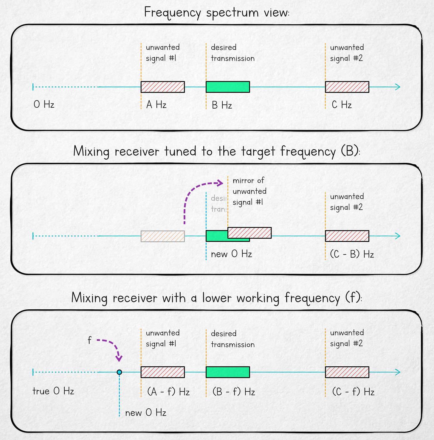 To avoid this mirroring, superheterodyne receivers mix the RF input with a frequency f that’s lower than the signal of interest, shifting the transmission to some reasonably low, constant intermediate frequency (IF) — and then using comparatively simple bandpass filters to pluck out the relevant bits. A visualization of the benefits of using this approach is shown below: