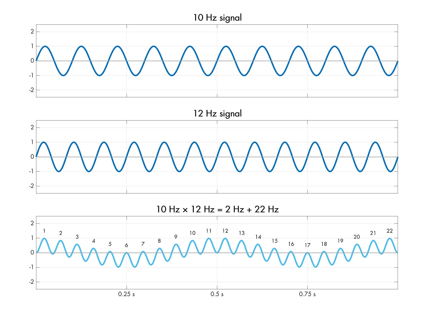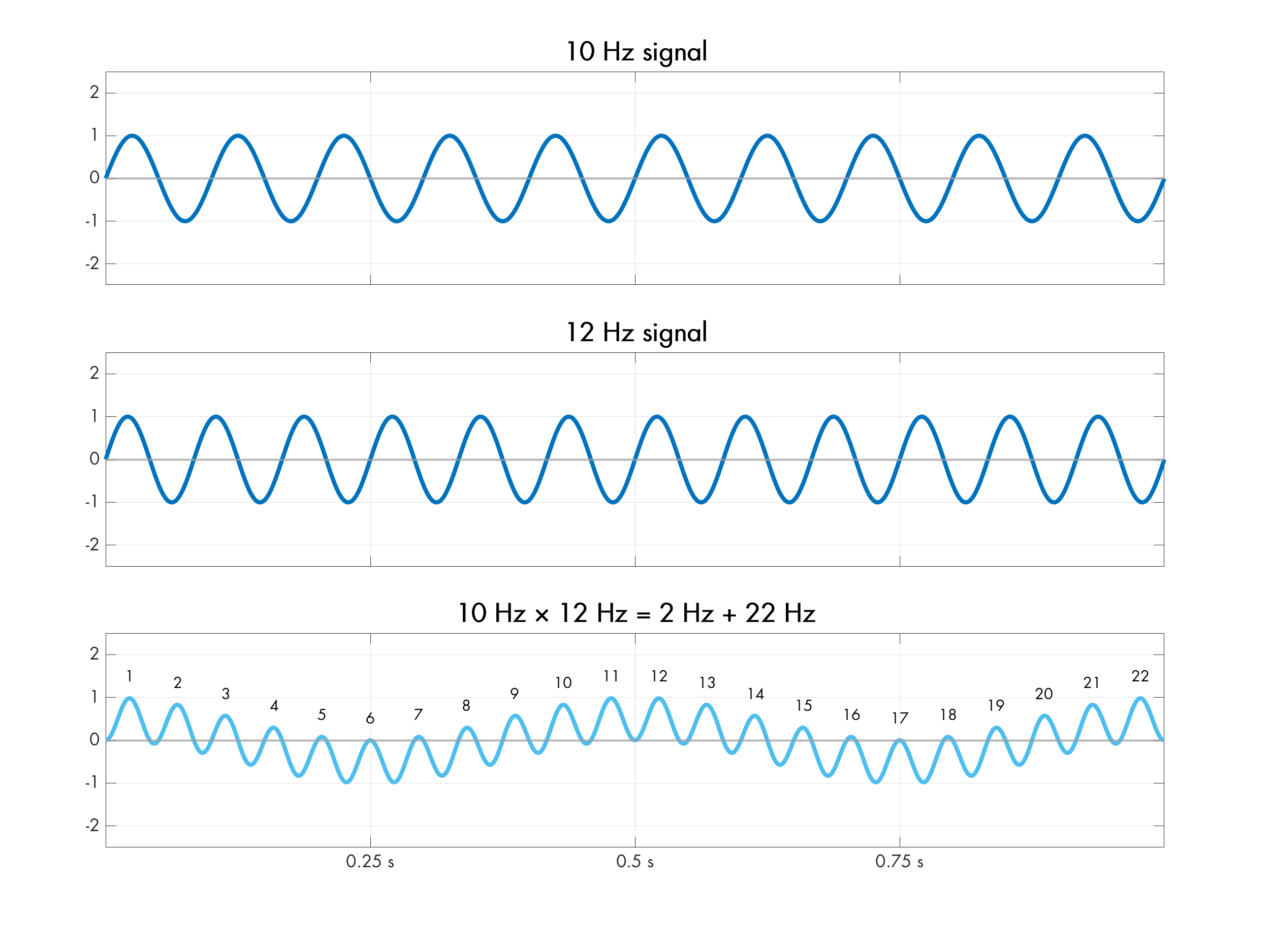 In the aforementioned article, we informally noted that the resulting composite waveforms have shorter periods if the original frequencies are far apart, and longer periods if the frequencies are close. Now, a more precise mathematical model is in order. As it turns out, for scalar multiplication, the low-frequency cycle is always |f1 - f2|, superimposed on top of a (less interesting) high-frequency component f1 + f2: