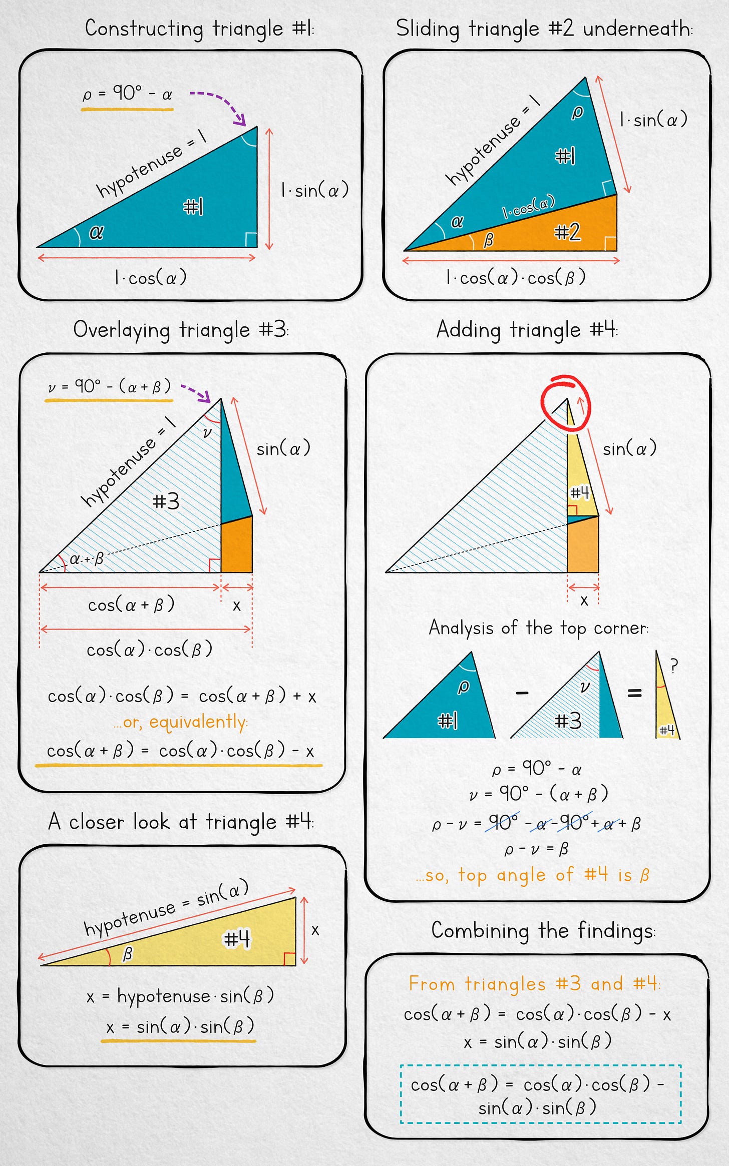 Panel 3 (middle left): we add another right triangle #3, overlaying it on top of the other two. The new triangle inherits a hypotenuse of 1 from triangle #1, and has a combined angle of α + β as a consequence of being partly inscribed inside #1 and #2. It follows that its adjacent is 1 · cos(α + β).