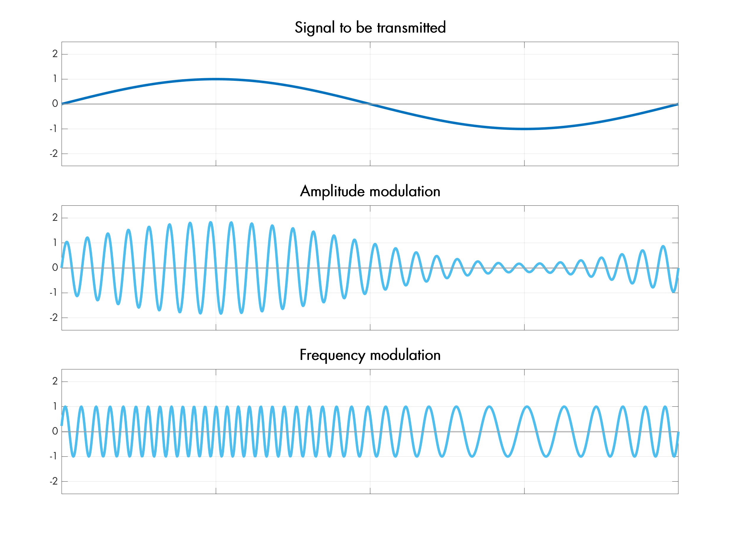 On the more advanced end, there’s phase modulation (PM) and quadrature amplitude modulation (QAM), the latter of which robustly conveys information via the relative amplitude of two signals with phases offset by 90°.