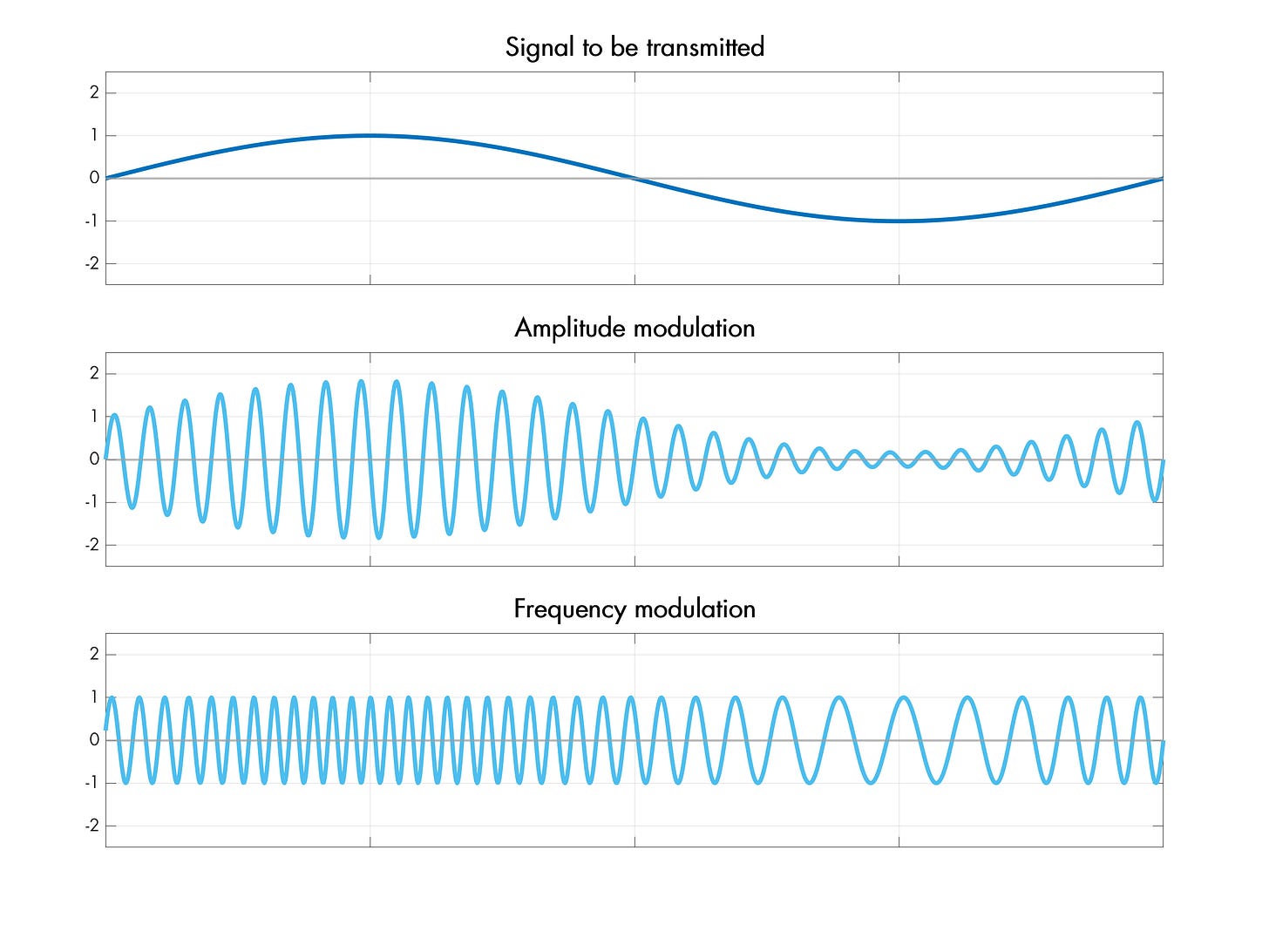 Compared to antenna design, signal modulation is a piece of cake. The two classics are amplitude modulation (AM), which changes the carrier’s amplitude to encode information; there’s frequency modulation (FM), which shifts the carrier up and down: