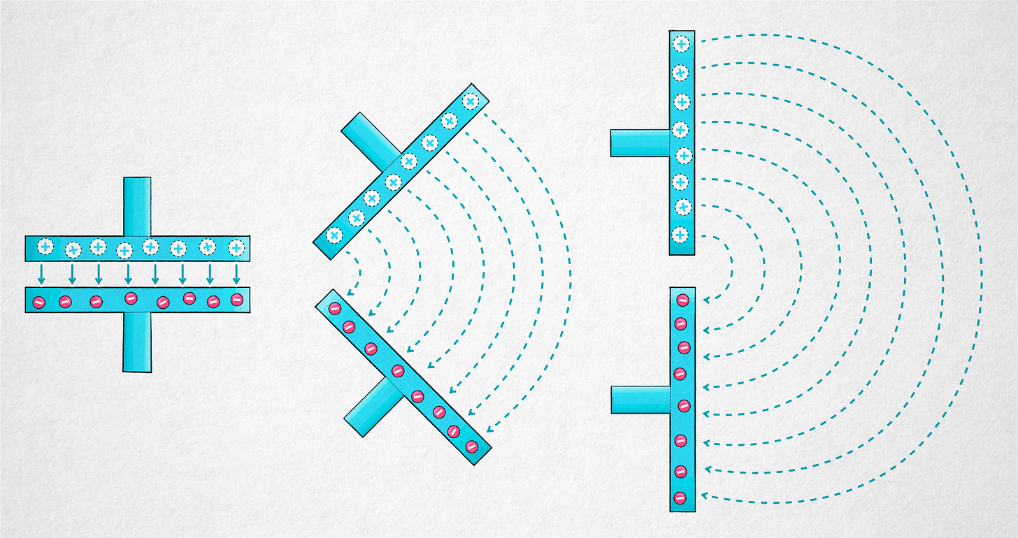 Electric fields can be visualized by plotting the paths of hypothetical positively-charged particles placed in the vicinity. For our ex-capacitor, we’d be seeing arc-shaped lines that connect the plates — and strictly speaking, extend on both sides all the way to infinity.