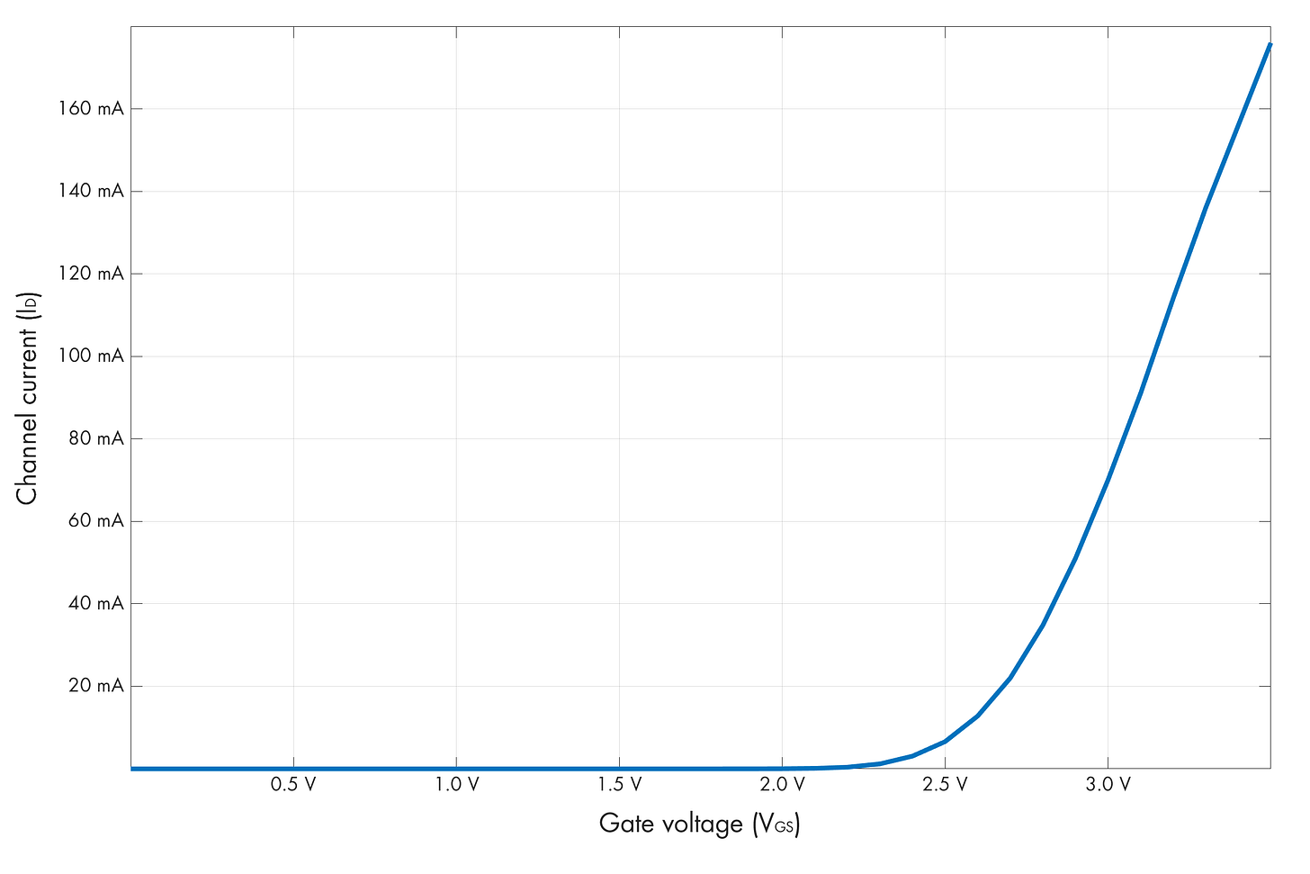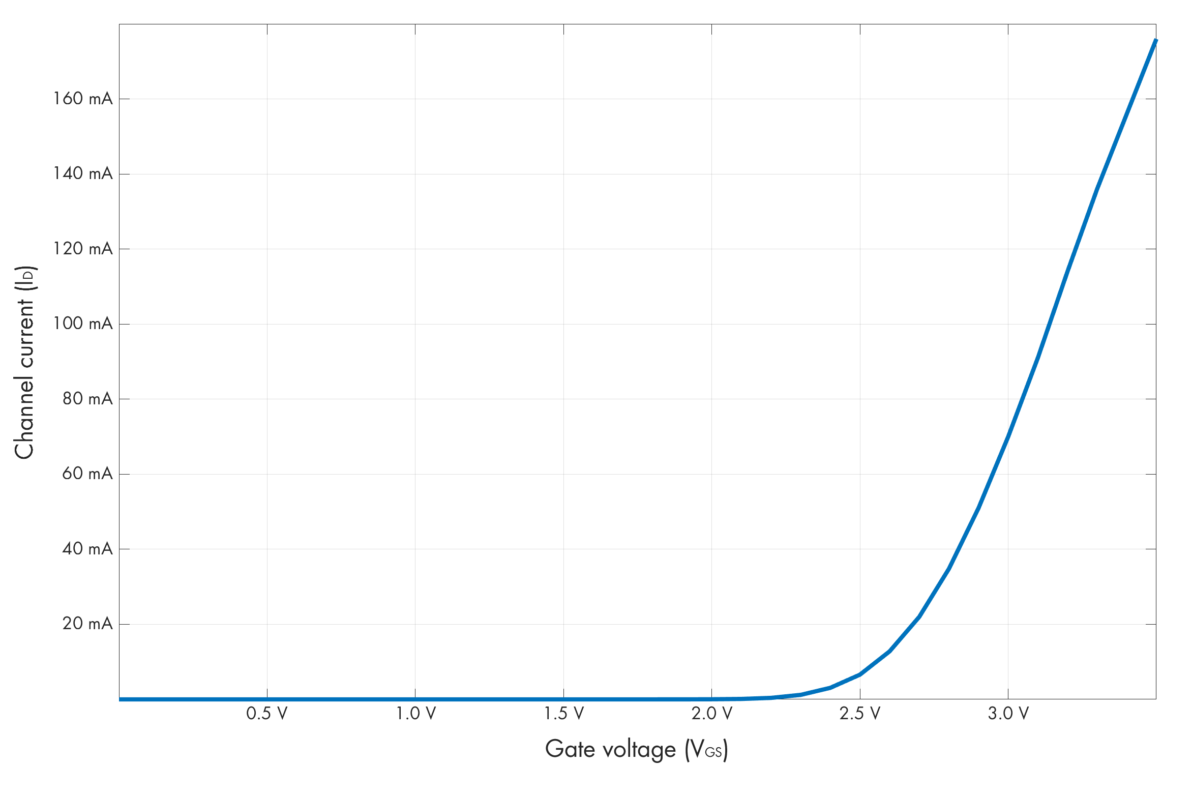 This transistor remains non-conductive until the Vgs voltage — the difference between its control terminal (gate) and its low-side terminal (source) — exceeds the transistor’s intrinsic threshold. The threshold voltage (Vth) usually hovers around 2 V, but varies from one transistor to another. Once Vgs clears Vth, the device starts conducting (at first only slightly), and the load is energized.