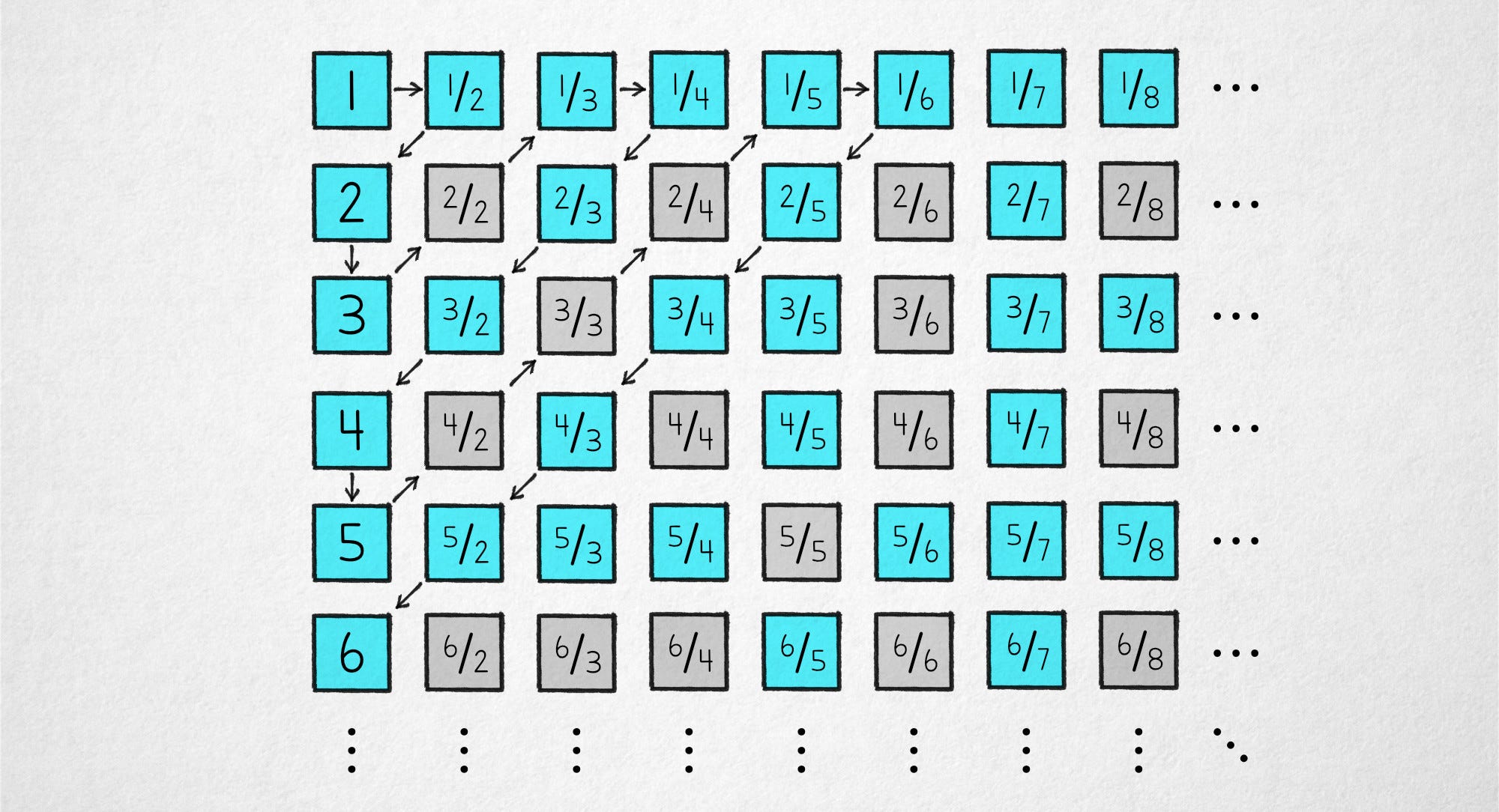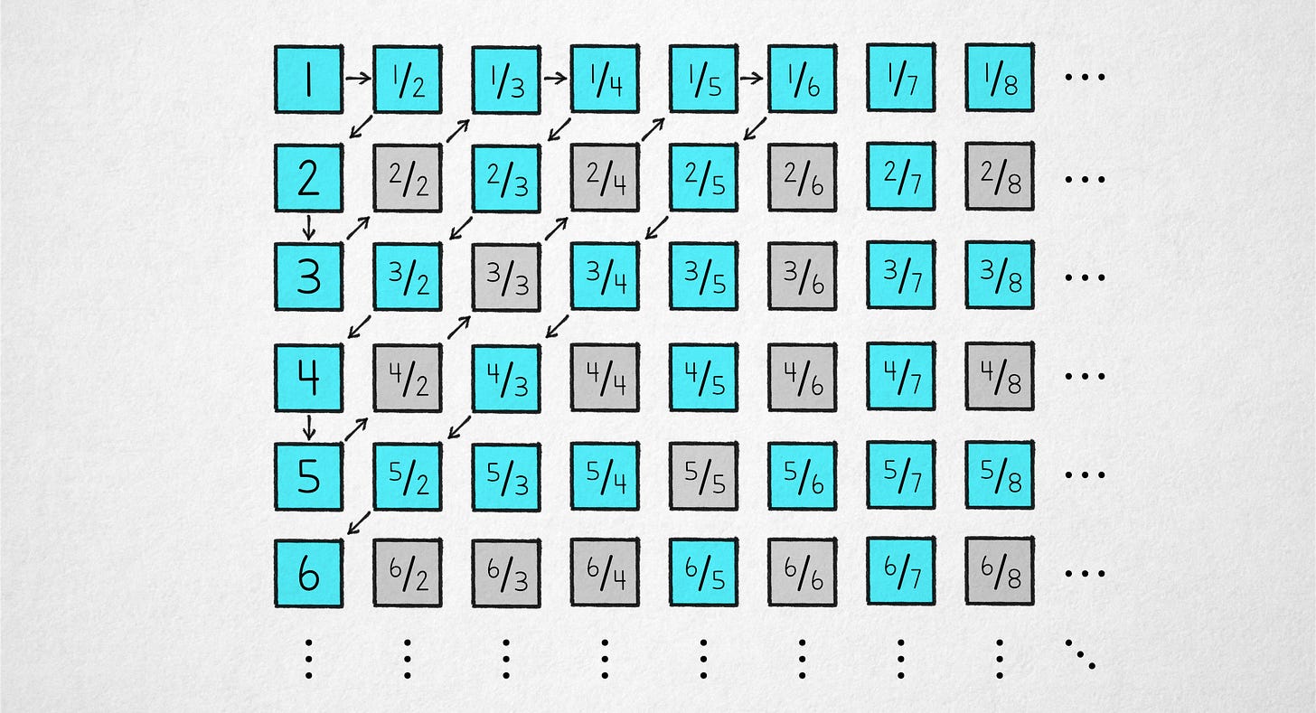 With the rationals laid out, we can traverse this grid in a way that lets us assign every tile to an integer without leaving any gaps and without ever running out of members of ℕ. The start of one such traversal pattern is indicated by arrows in the figure. We start in the top left corner, move one tile to the right, take a a sharp turn to and start moving diagonally until we hit the vertical edge, move one tile down, and then follow a diagonal pattern back. Rinse, repeat. By analogy to what we’ve done for integers, the result doesn’t change if we toss negative rationals into the mix.
