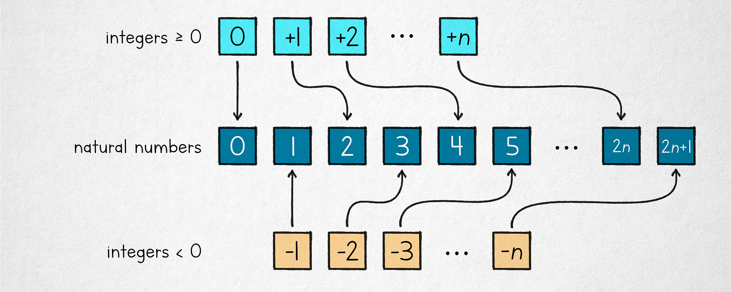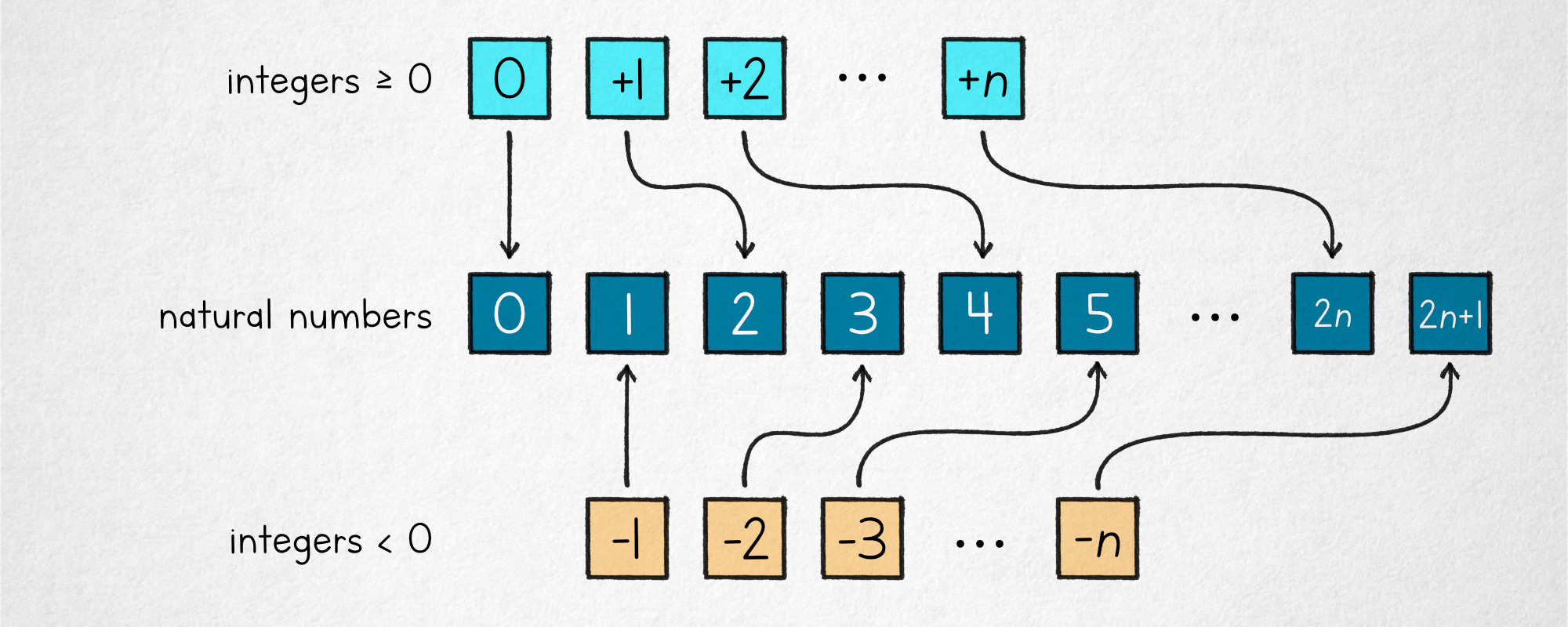 We’re mostly done with integers, but before we wrap up, let’s ponder if the set of integers is “larger” than the set of natural numbers. By some metrics, you could argue it is. That said, as hinted in the earlier article, every integer can be mapped to a natural number without the risk of running out of naturals: