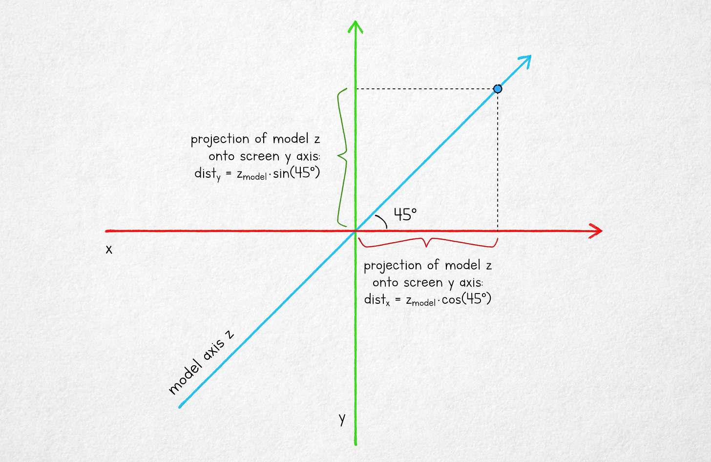 To convert the model-space z value to screen coordinates, we can use trigonometry to project the component onto the real x and y axes: