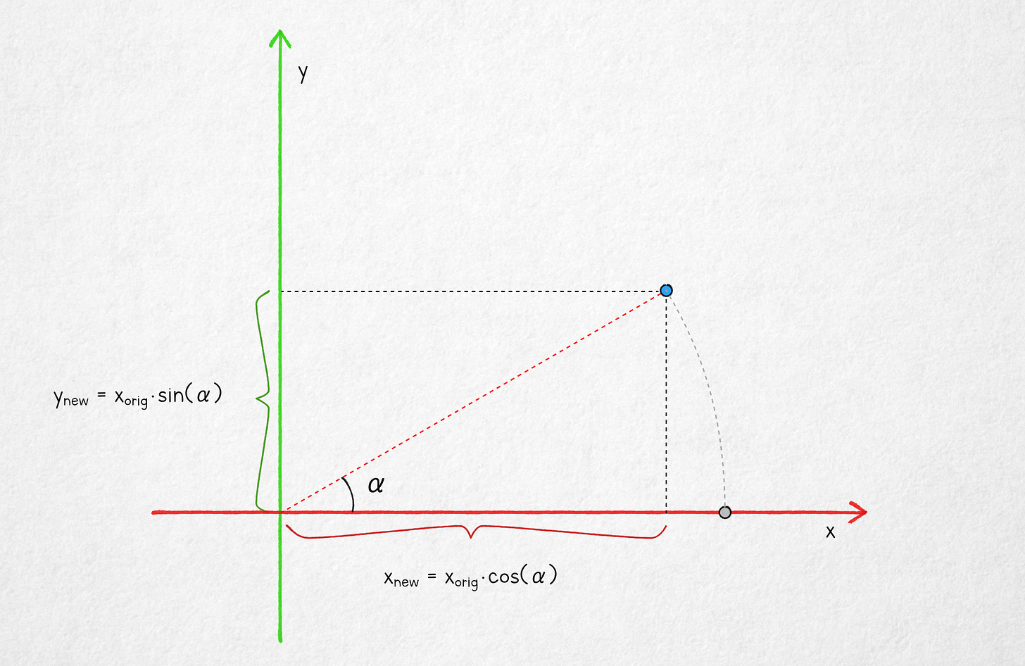 From basic trigonometry, the new x coordinate of the rotated point is the adjacent of a right triangle with an angle α and a hypotenuse of xorig. The new y is the opposite of that same triangle. If we want to start with a non-zero y coordinate for the point, we need add a small tweak: