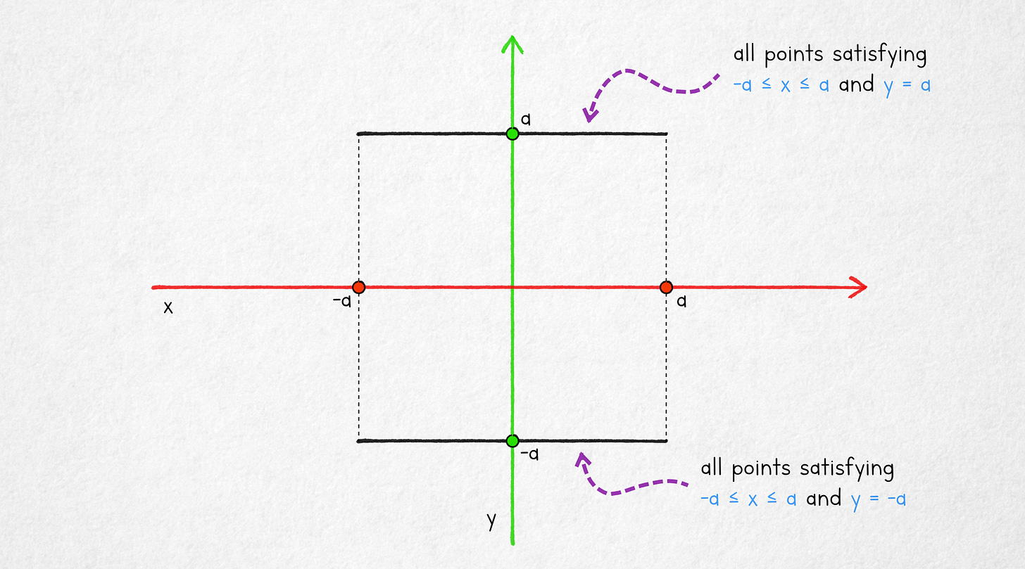 In essence, we’re saying that we want to include points for which the y coordinate is equal to either -a (the lower edge) or +a (the upper edge); and where the x coordinate spans anywhere between -a and +a: