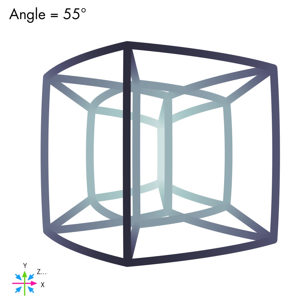 At first blush, the tesseract visualization might look just like two nested 3D cubes connected in the corners. To reduce edge overlaps and better hint at the underlying shenanigans, we can switch to a curvilinear “fisheye” perspective, reminiscent of what you can see through a peephole or other low-quality, wide-angle lens. In this approach, point coordinates are reduced based on their Euclidean distance from a single reference point representing the camera. For a regular cube, we get:
