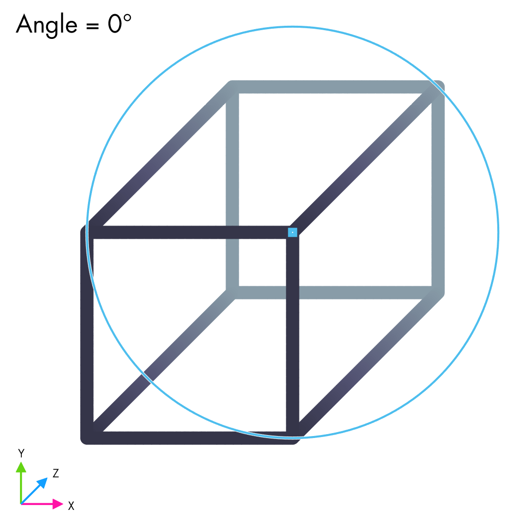Both trigonometric expressions can be further divided by √2 if the goal is to match the model- and screen-lengths of a horizontal line drawn in the model XY plane and then rotated by 45° around the y axis. That said, it’s seldom a necessity.