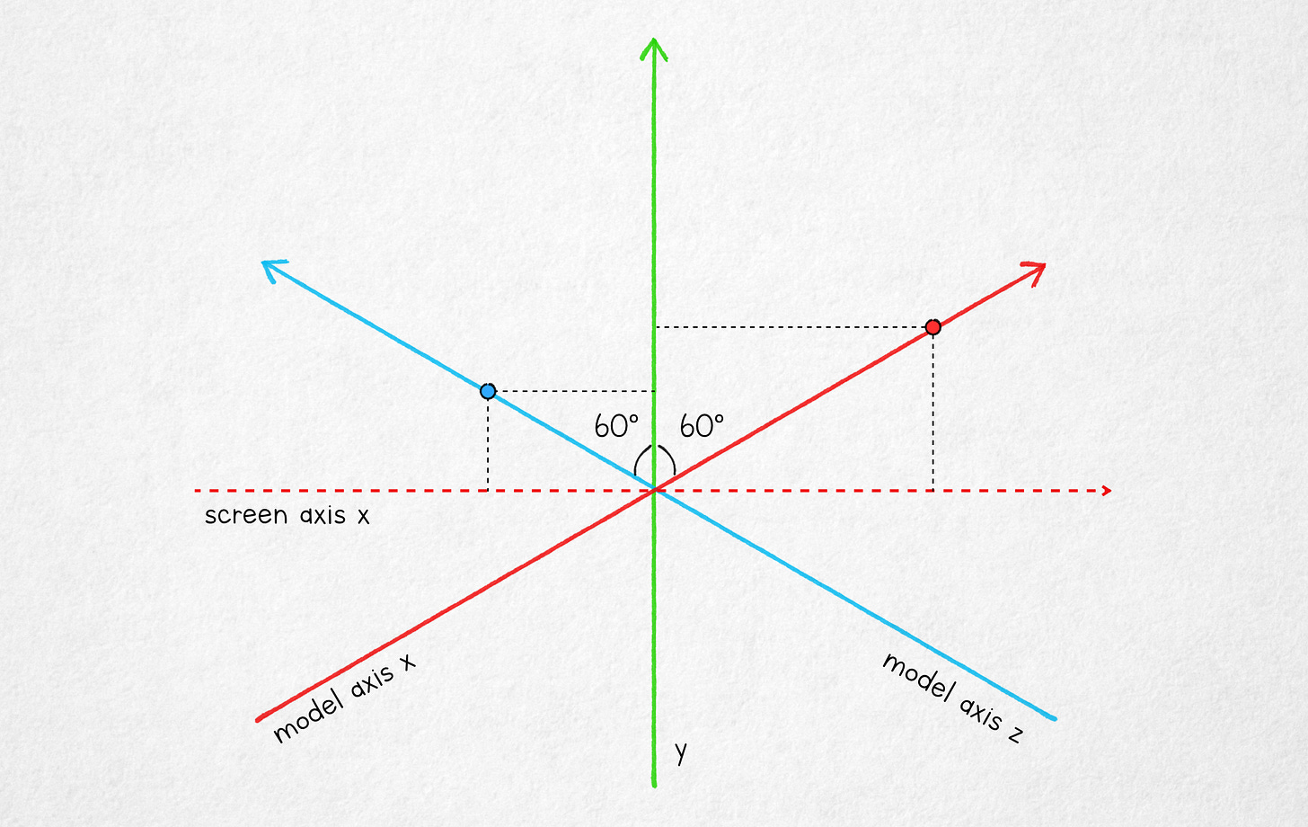 The math for this projection is still simple. The screen x coordinate is dictated by model x multiplied by cos(30°) — that’s the angle between the model x axis and the real one. The value is also influenced in the same way but with an opposite sign by the model z axis, so we get: